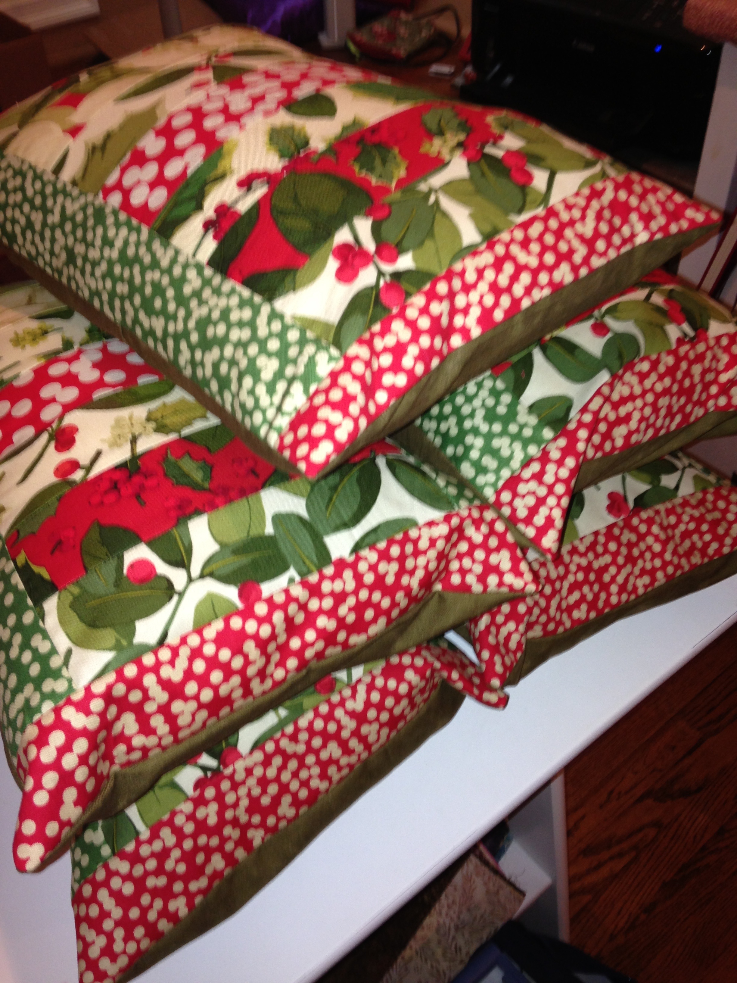 A week and a half ago I got a custom order on Etsy for five holiday pillows. No problem! I was psyched as it was my largest custom order to date. I carefully calculated the fabric and had just enough to get them done.