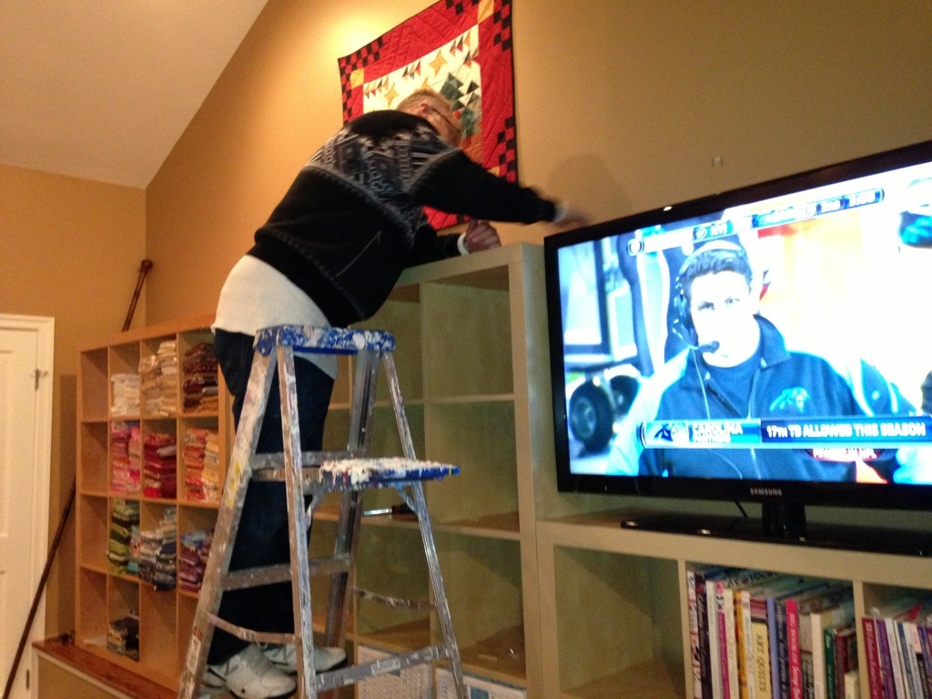 Of course this little Christmas gift to self meant a whole lot of work for Rob. The machine takes up a lot of space so we are rearranging the sewing room. New shelves, raised off the floor will give me lots more storage and the Archie Bunker lazy boy will be retired – to either the curb or the basement.
