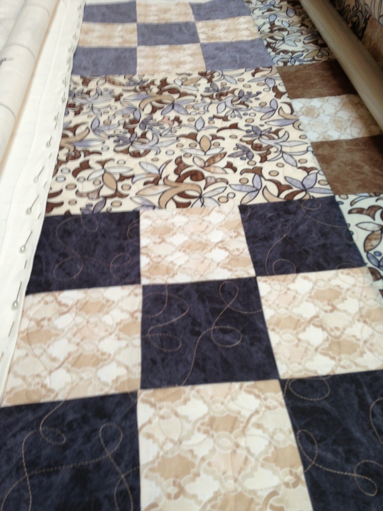 We got back from visiting my parents in Florida yesterday and the first thing I did was start practicing on the longarm machine. Cathy and Dale from The City Quilter were kind enough to leave some muslin set up so I could practice right away. After a bunch of practice yesterday, I was ready to load a quilt and give it a shot today.