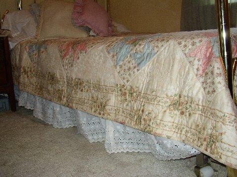 This is a queen sized quilt that I made for my Mom’s 60th birthday. I believe she turns 75 this summer, so this quilt was made a long time ago. It was one of my earlier efforts. My mom loves aqua and wanted something soft and floral that would read feminine. This was a Moda fabric that immediately got me hooked on quilt-shop fabric.