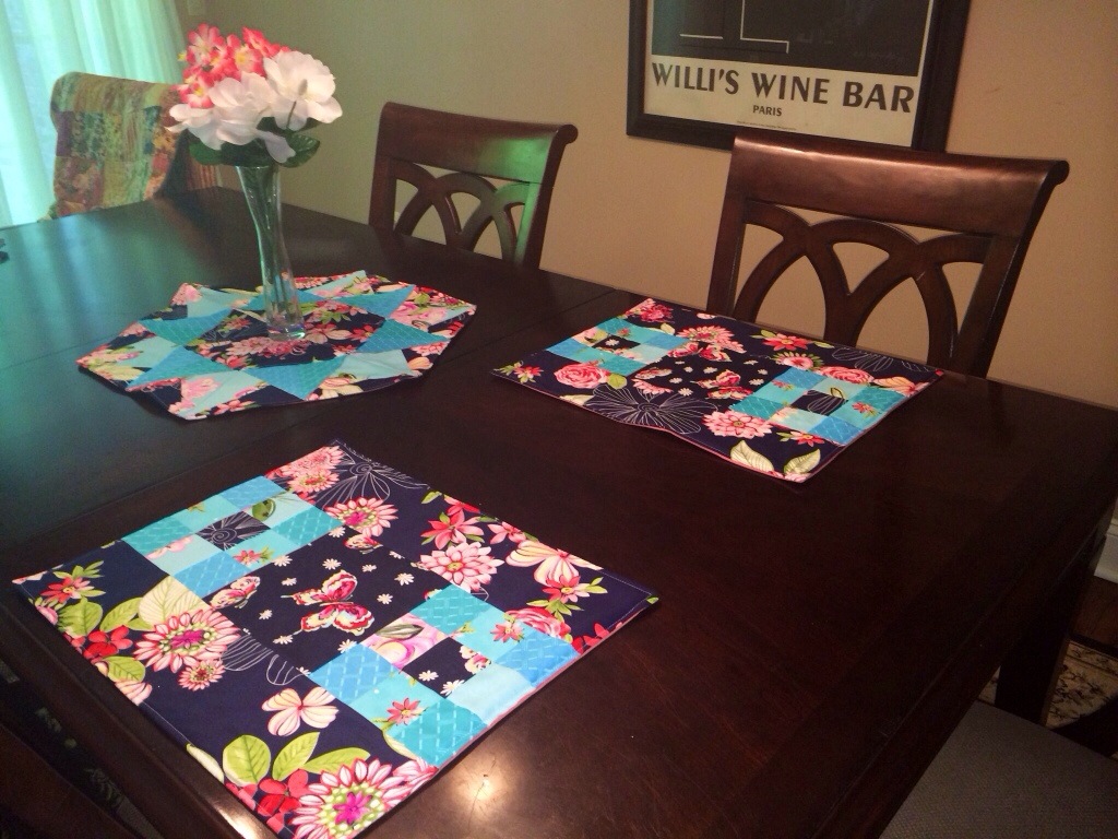 First up, a table topper and two placemats. I made a table runner from this fabric, but met a woman at the Nyack show that wanted a smaller table centerpiece and two matching placemats. They are a gift for her daughter who is moving into her first apartment.