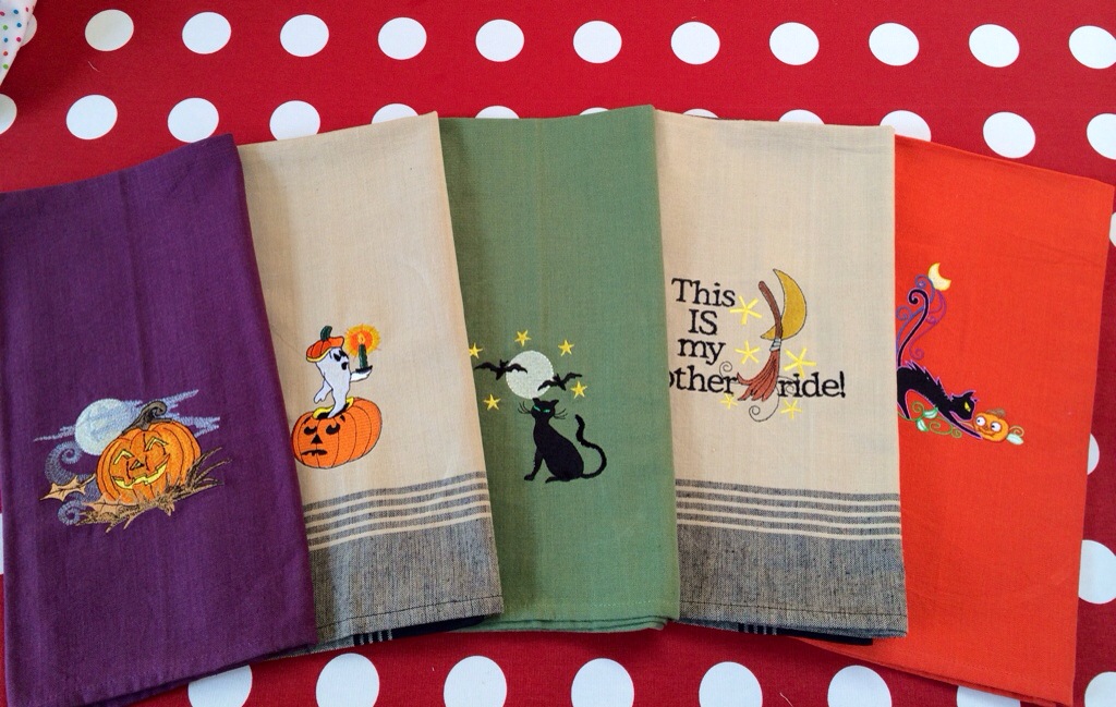 I love Halloween. The day has held a special allure ever since I was a child and worked in my Dad’s Halloween store. So, today I pushed the season just a bit and did up a bunch of Halloween tea towels.