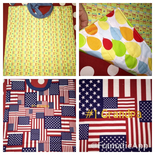 I had a woman at the last craft show ask me about adult bibs. I have made them before – for my friend Pam who sadly has passed and for my mom. The well-endowed ladies like them to protect their blouses while dining. They were especially cute with lobsters on them, or spaghetti. This lady wanted them for her dad for a very practical use. He is handicapped and needs a little help at mealtime. Her adorable daughters picked fabric, one celebrating his birthday with balloons and the other celebrating his being a veteran with American flags and an embroidered inscription, “#1 grandpa”.