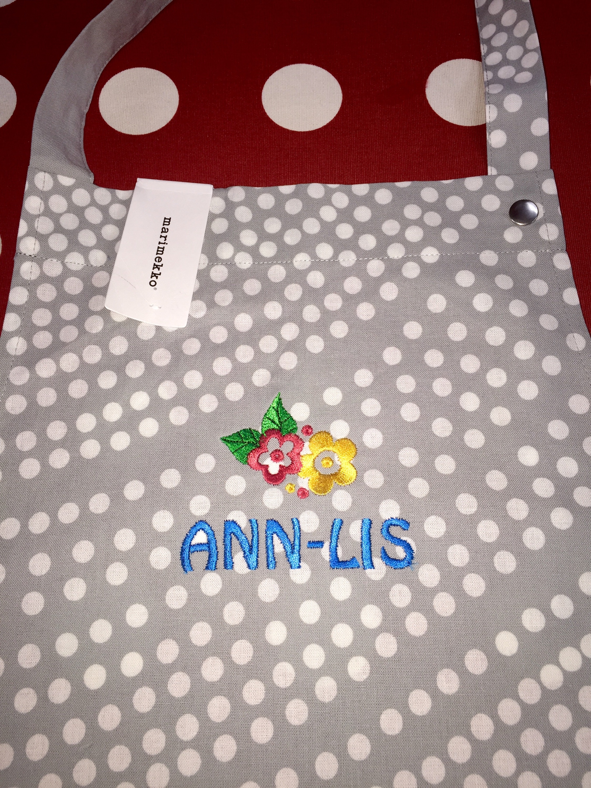 My mother in law got an embroidered apron. Last year I made her one, but there is a merimekko in my building at work. Since she is from Finland and loves their items, I bought the apron and added the embroidery.