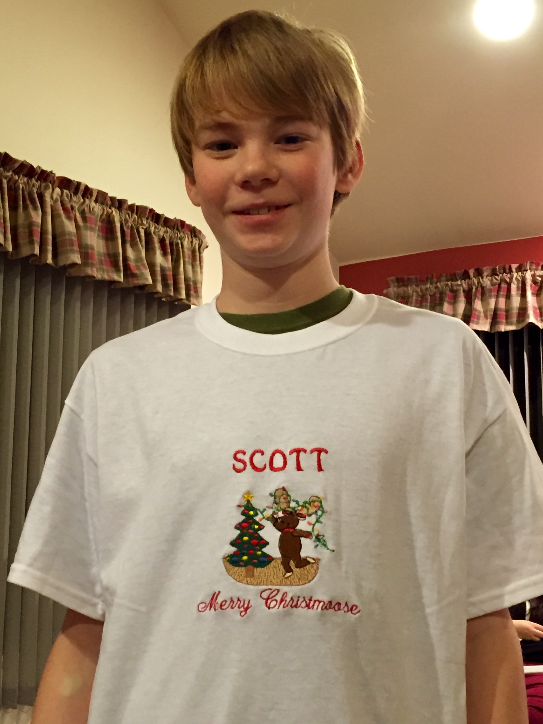I learned in Christmas Eve that our nephew Scott is obsessed with mooses. His sister asked me to make him a moose shirt, and she loved the pun, “merry christmoose.” We even got him to wear the shirt!