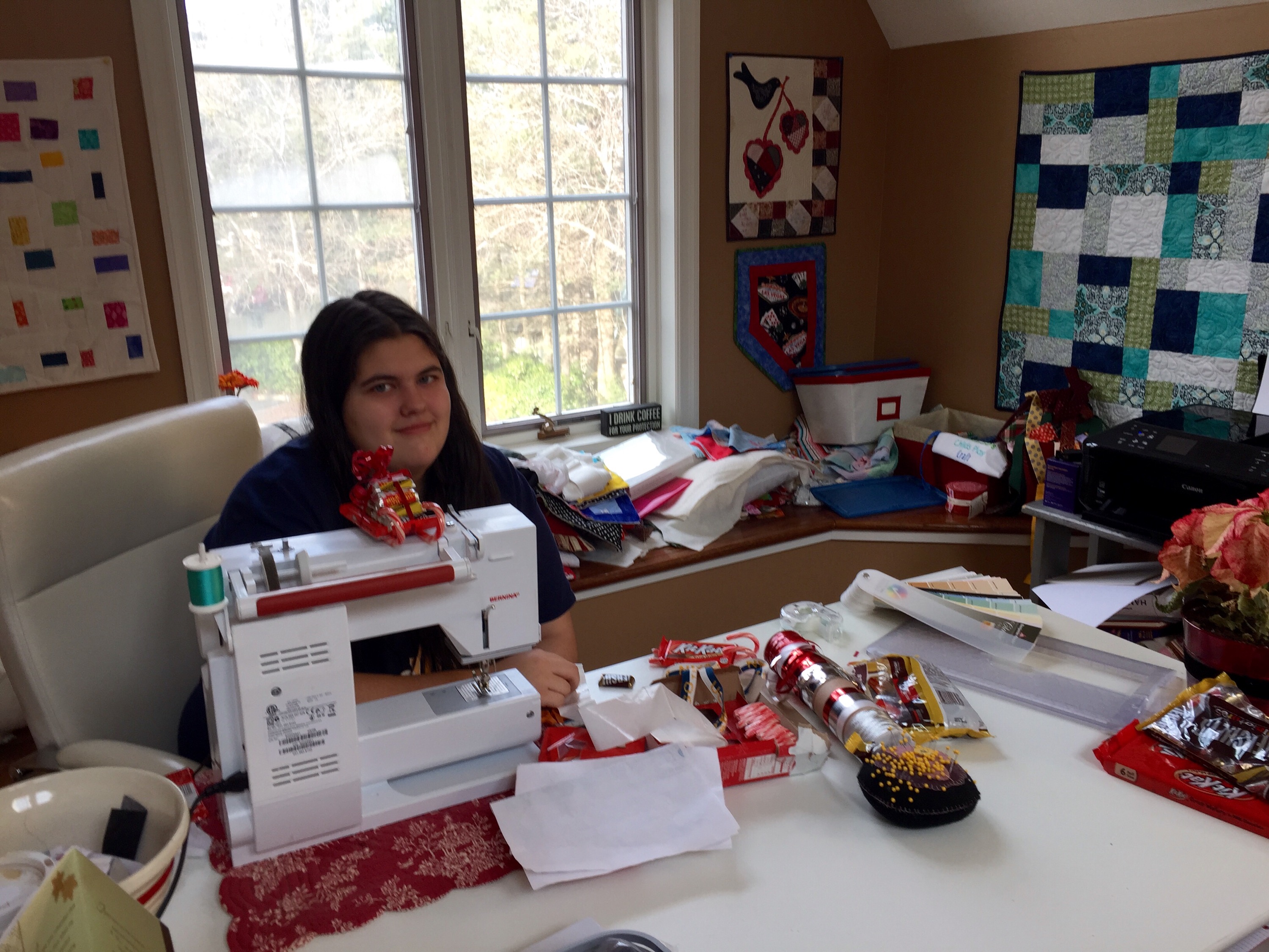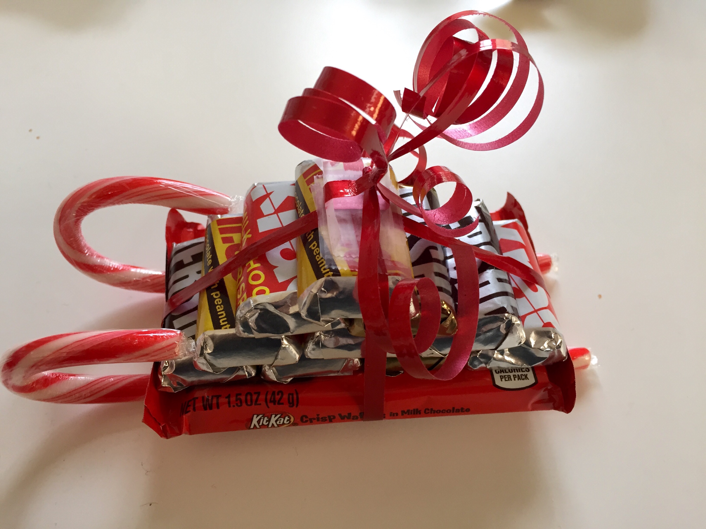Normally Maddie being in the sewing room wouldn’t be newsworthy, but today she did something crafty. While we were in Florida, her grandma T showed her how to make these adorable Santa sleighs using candy, glue dots and ribbon.