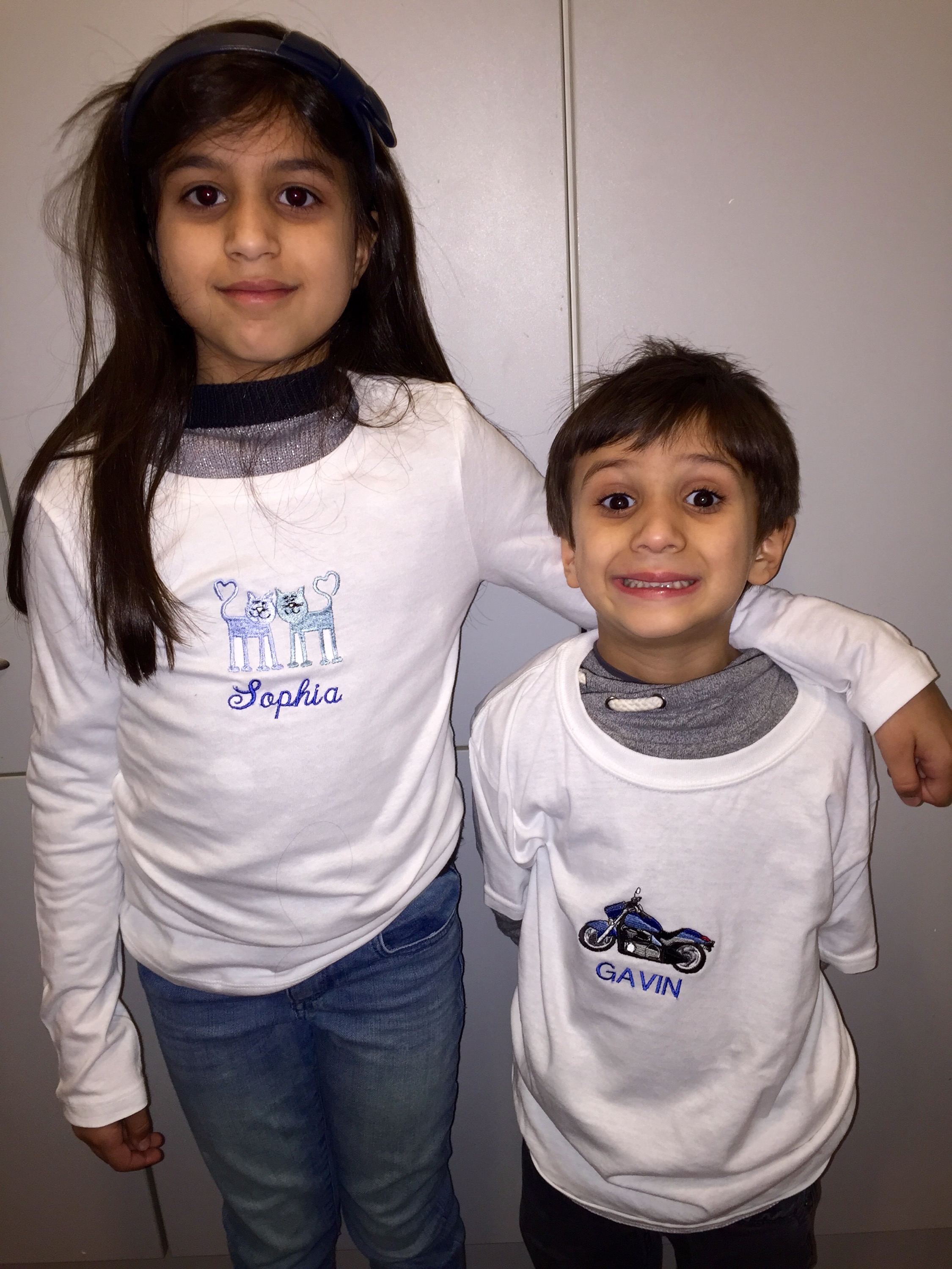The kids were mesmerized by the embroidery machine. Sophia is a mini-fashionista to begin with, and Gavin was interested too. So, making spring merchandise quickly became making t-shirts for the kids. They each picked their pattern and colors and even the font for their names.