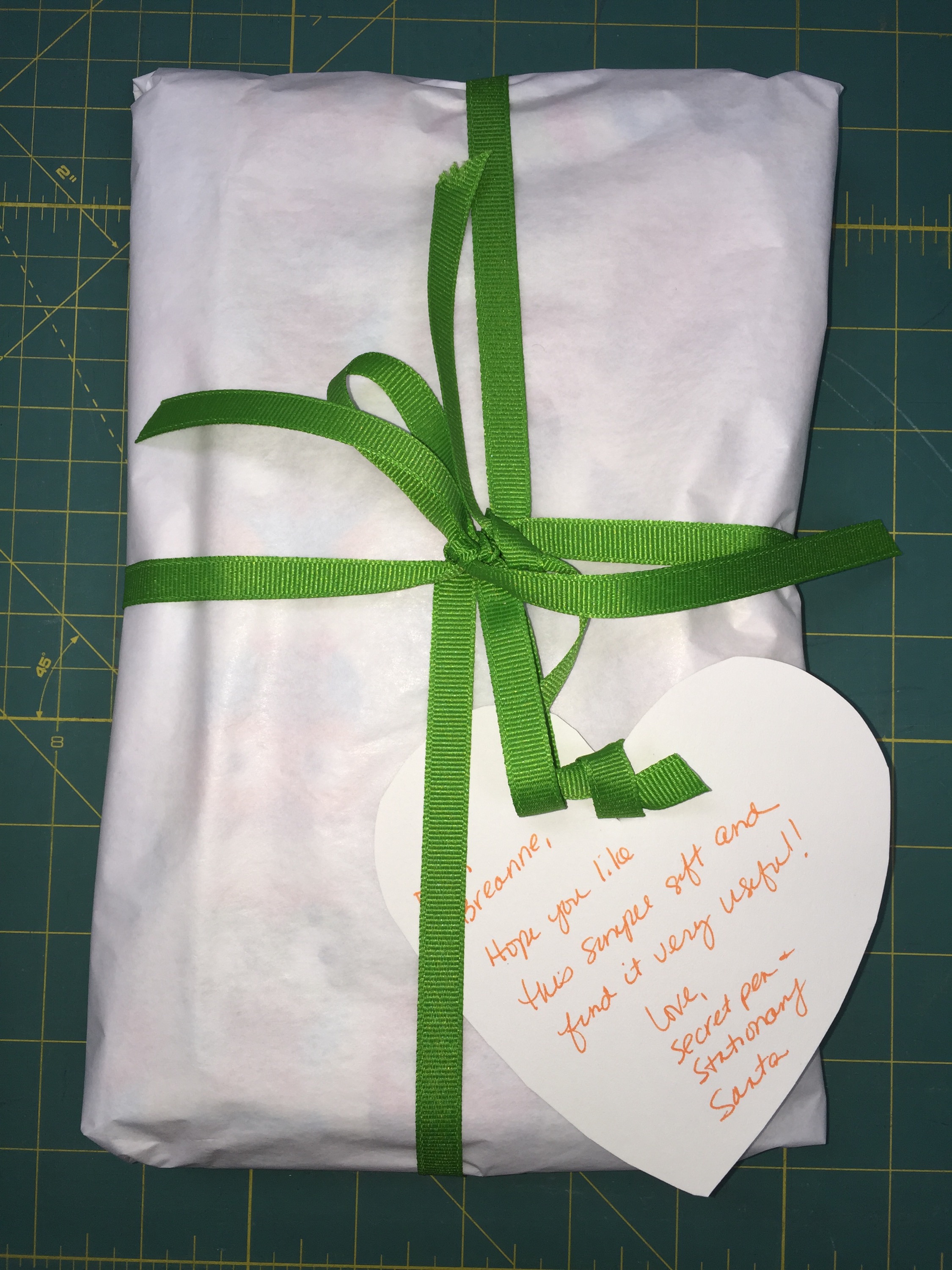 The notebook case wasn’t the special part. The woman who orders this is doing a secret pal swap. So she asked me to wrap it and add a note. Unfortunately I am low (hard to believe) on non-Christmas gift wrap but luckily I always have tissue paper and ribbon. So I wrapped it up and it’s in the way – and I know better for next time.