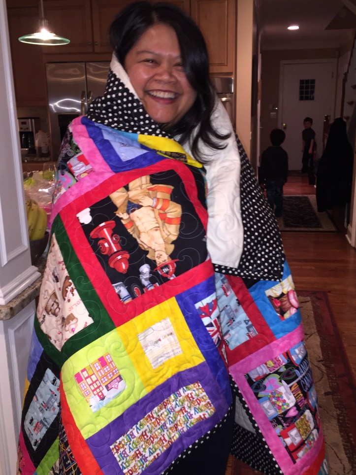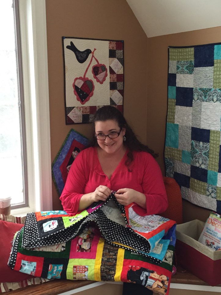 And here comes the embarrassing part. I took the quilt home to quilt and bind it. But didn’t do it. I was afraid of messing it up. So it sat. And sat. Until the holidays when I finally loaded it onto the machine and for some reason chose to do a pantograph. With blue thread. I don’t know what I was thinking. But I finally got it quilted and the Jen curled up and got it bound. It isn’t my best long-arm effort, but it was heartfelt. That counts for something, right?