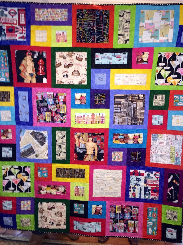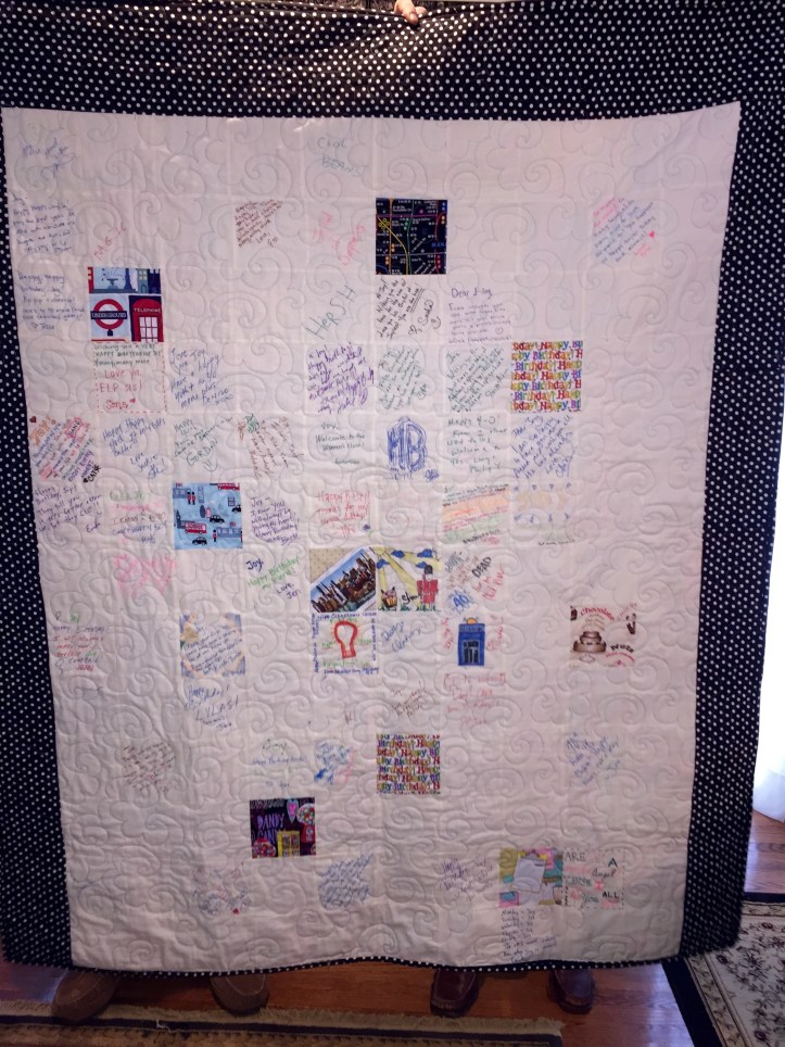 We put them all together as a signature side and brought the top and back of the quilt to the party with fabric markets. Those that didn’t get to sign in advance, signed at the party. Disclaimer – Some were very drunk when they did so. And some did so time and time again.