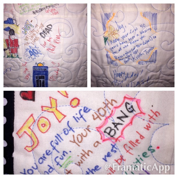 This brings me to the back of her quilt. Jen and I pieced the front and tried to coordinate with her sisters to get patches signed in advance to let folks write messages to Joy for her 40th.