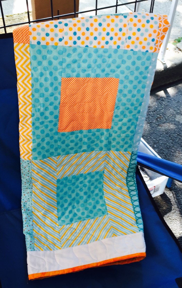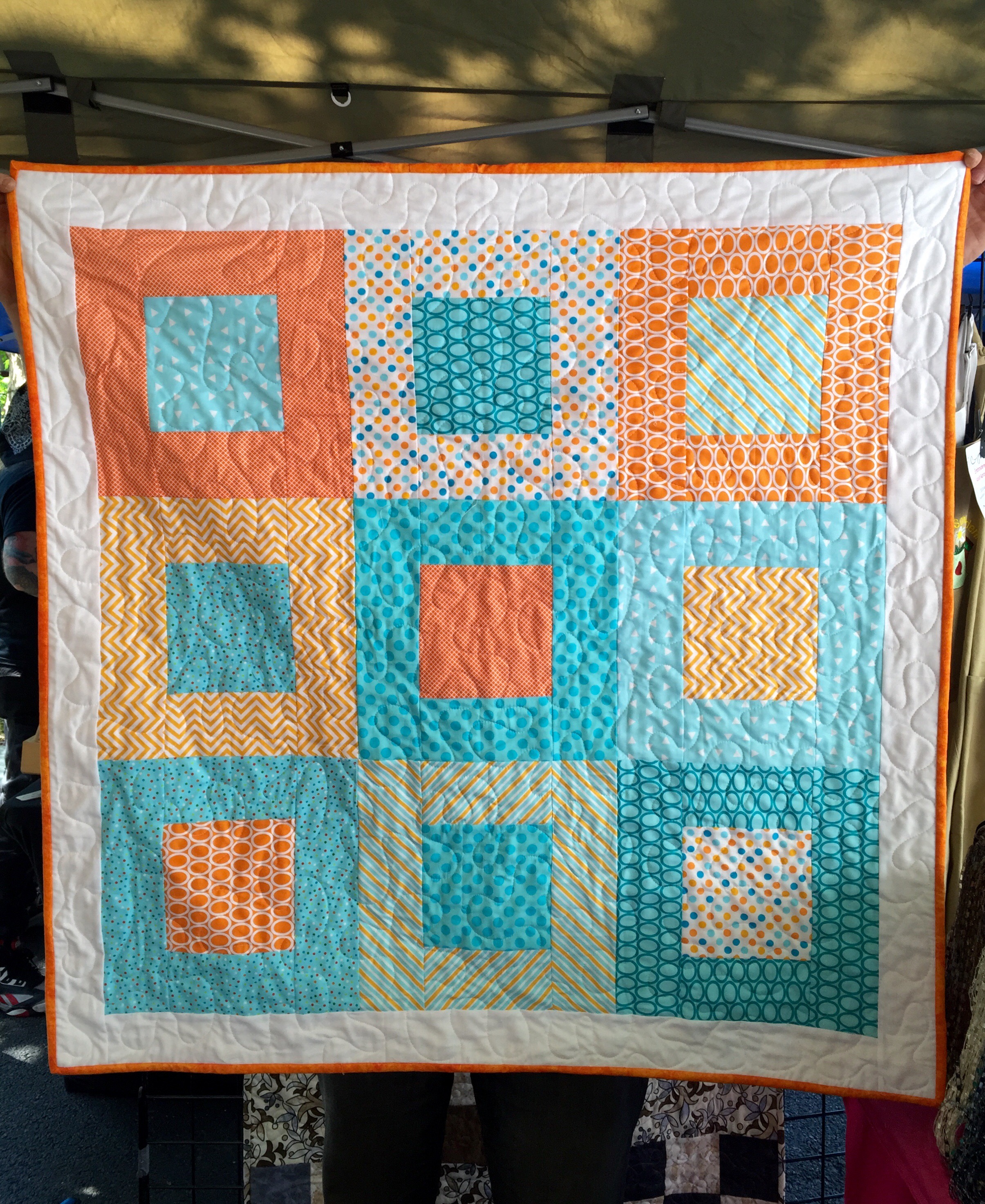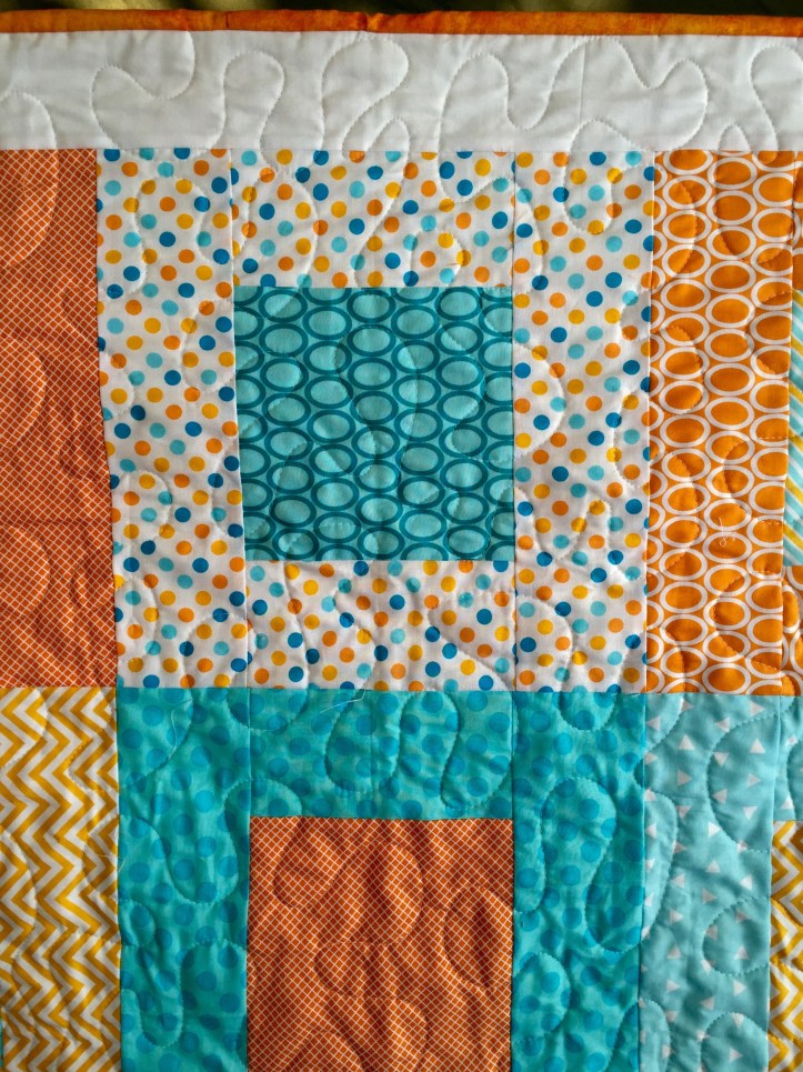 These big blocks went together very quickly. The white border helps to focus the eye and gives a little bit of relief to all of the color. The quilting is a simple meander in white cotton.