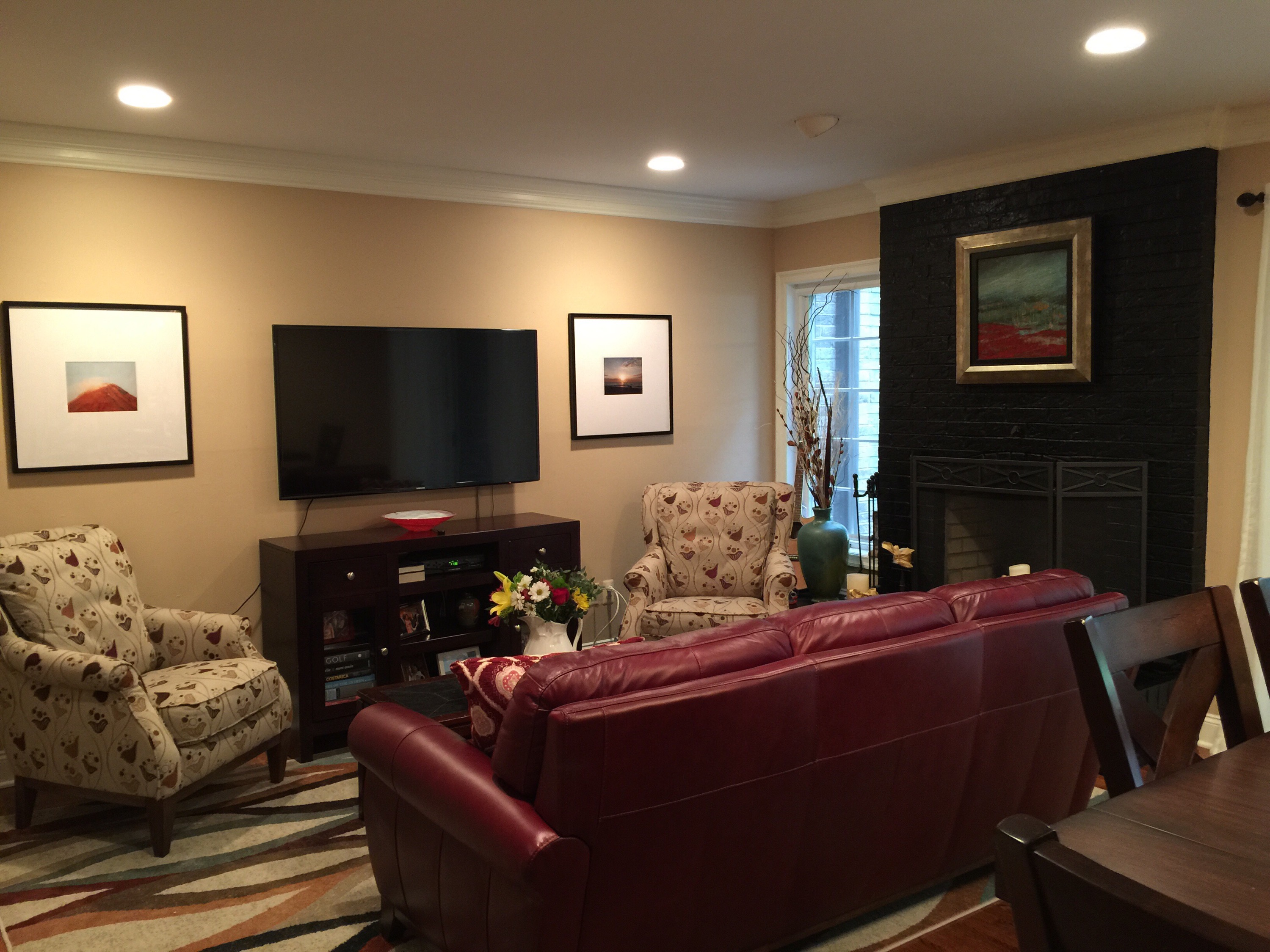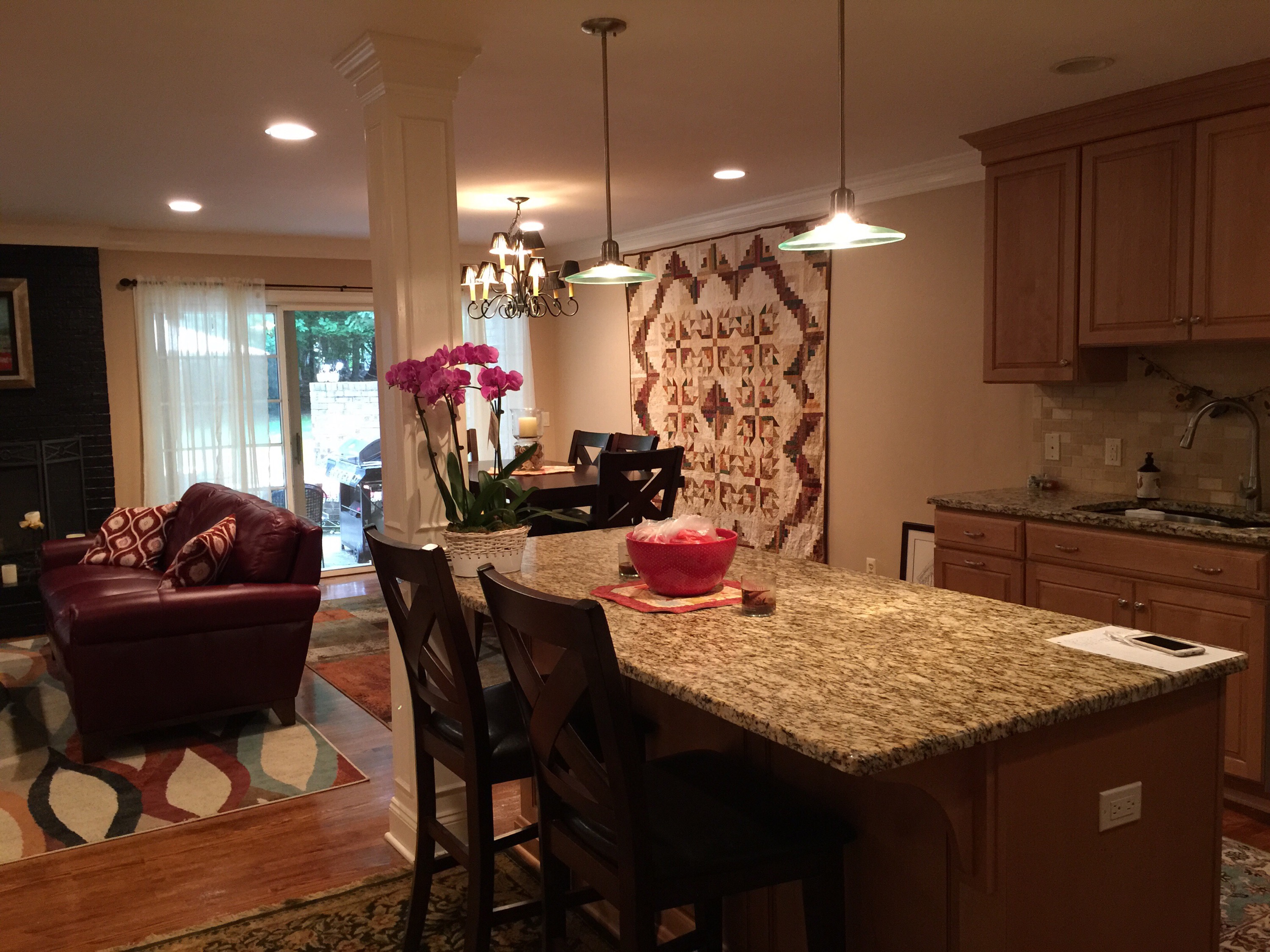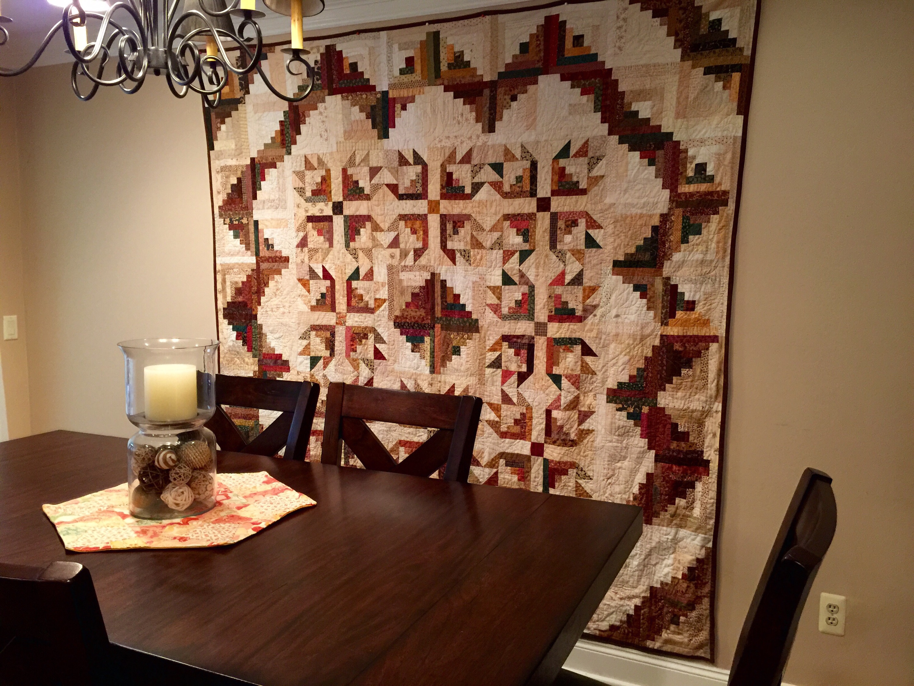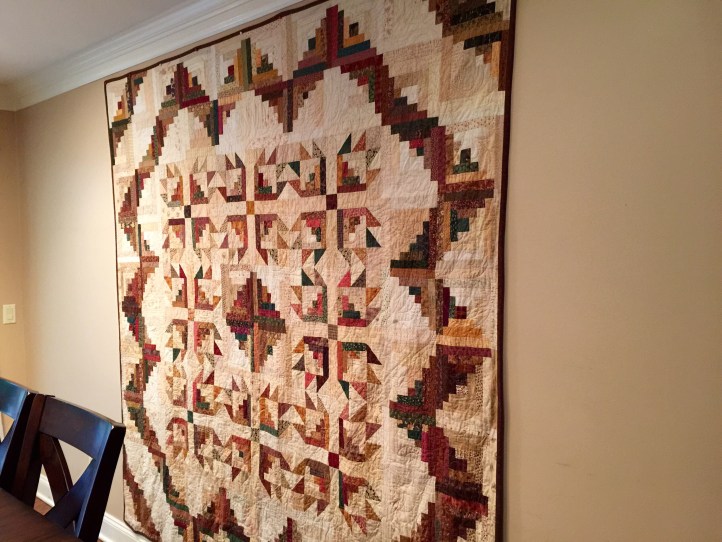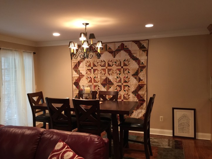 I was straightening up this morning and realized the wall in our living room /dining room was perfect for this. So we moved the other picture that was there to make room the quilt. We had an open floor plan – living room, dining room and kitchen as one big space, so we will all get to really enjoy this quilt a lot more now as we will be able to see it from all angles.
