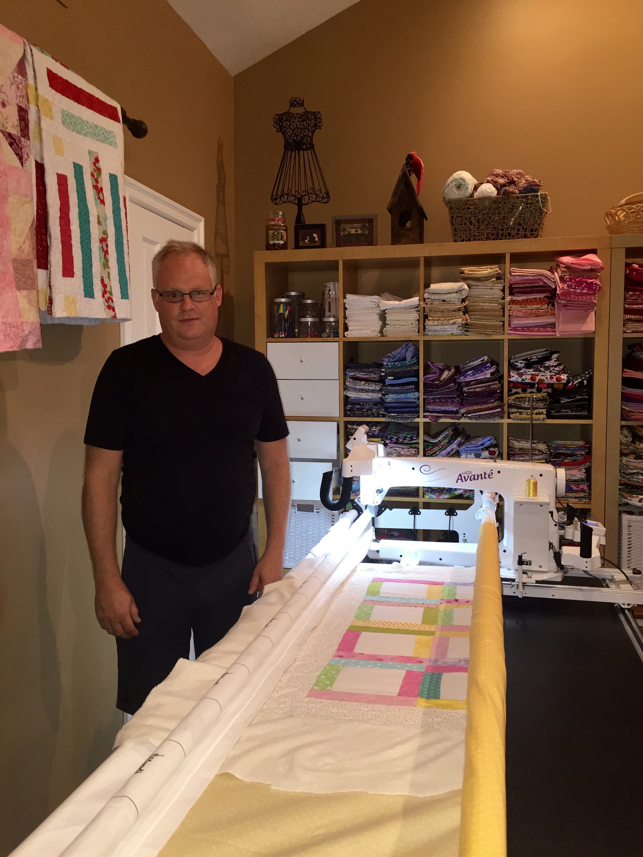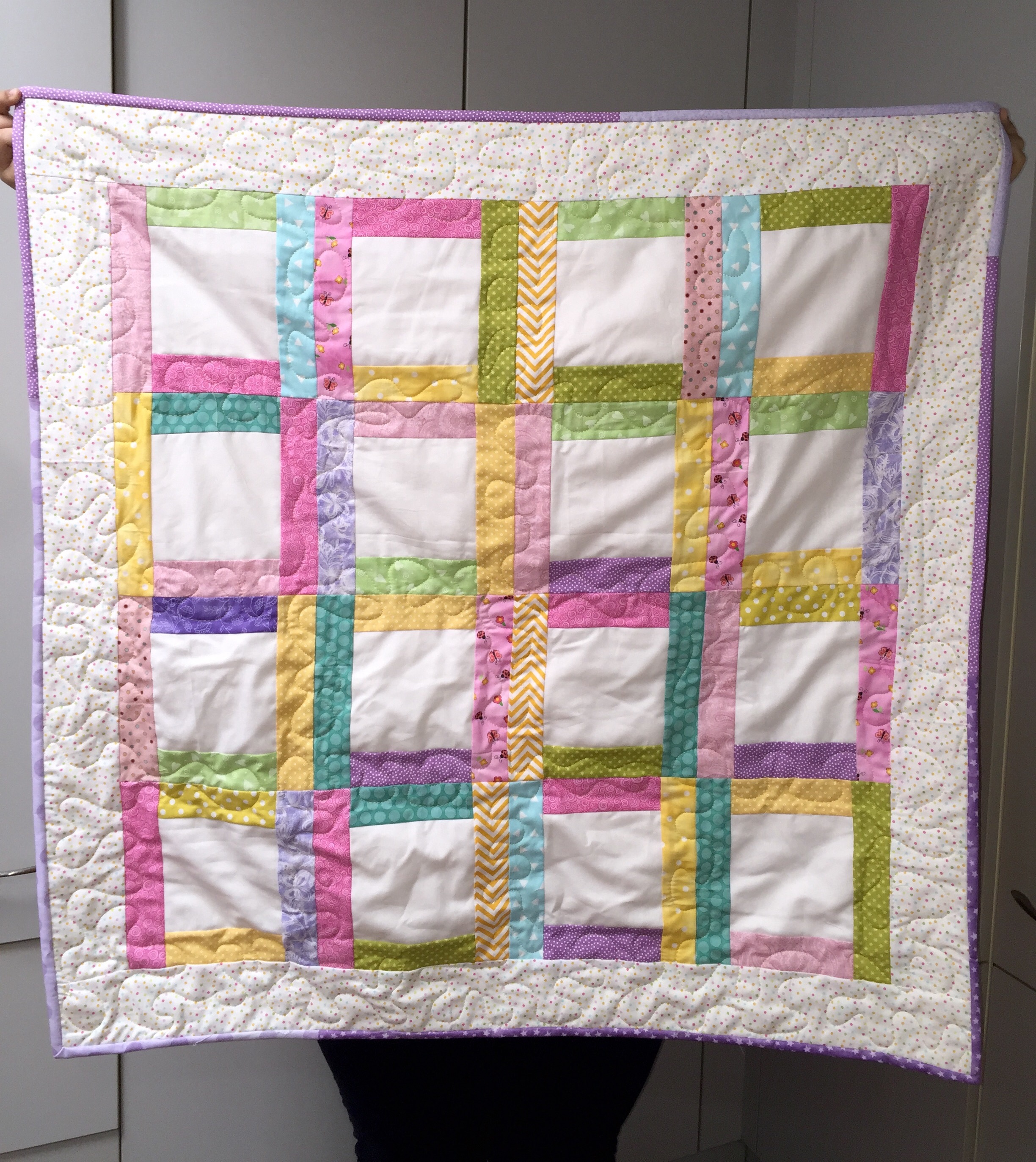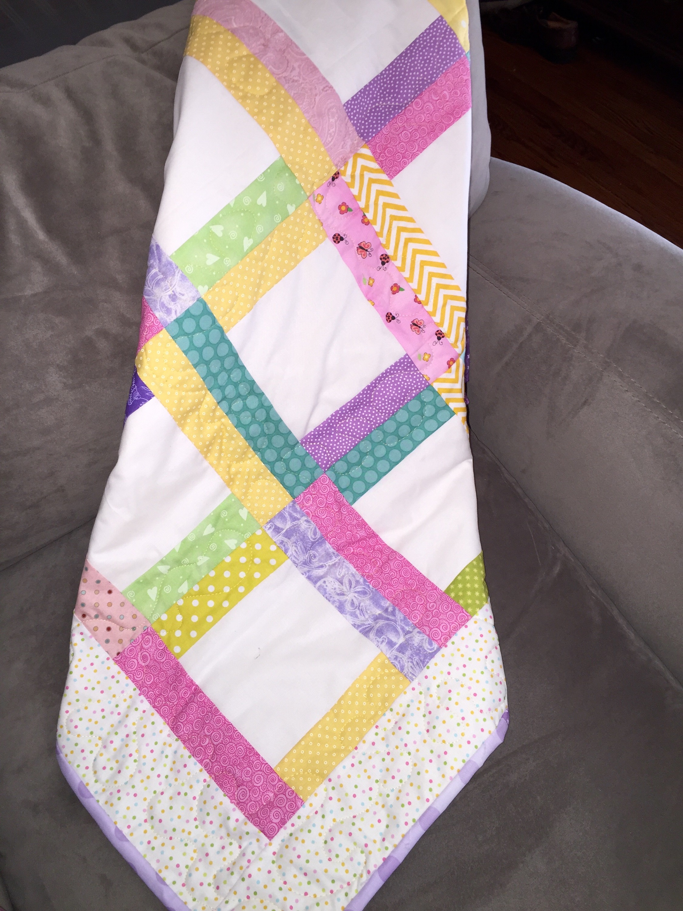I did a very simple pattern in bright girly colors. The center squares are 5″ finished and allow plenty of room for guests to sign, write notes or draw pictures. The dashing colors are replicates in the simple polka dot border, which is light enough to accommodate additional signatures if needed. And, when quilting, I did a simple stipple but left the squares free so people could write more freely.