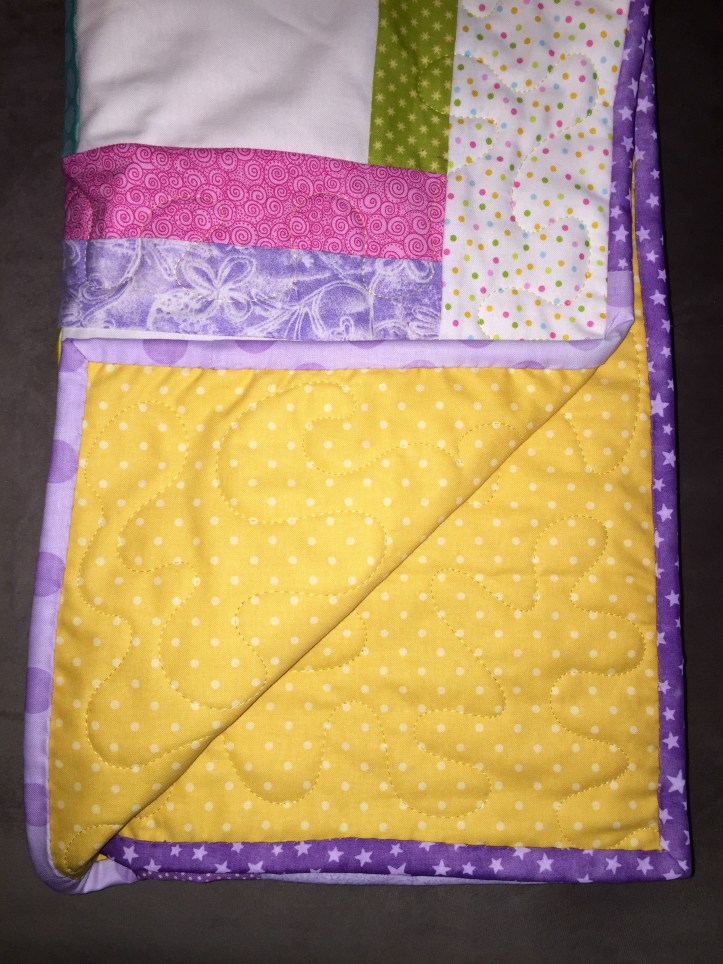 The back is a coordinating yellow with white dots and the binding is a scrappy lavender. This quilt will hang on a yellow wall when done so it should work out well.