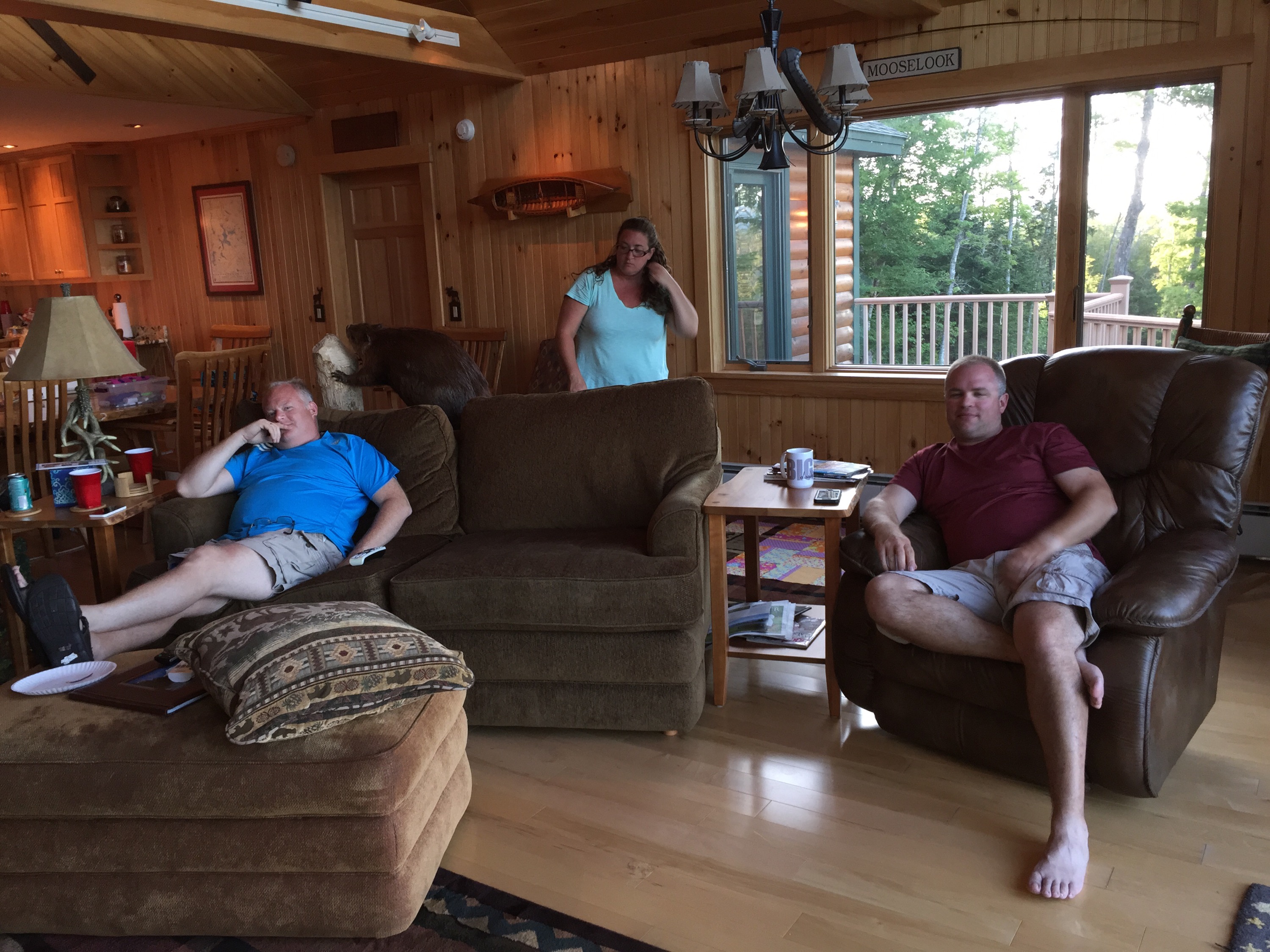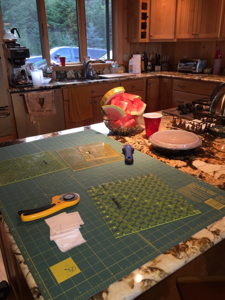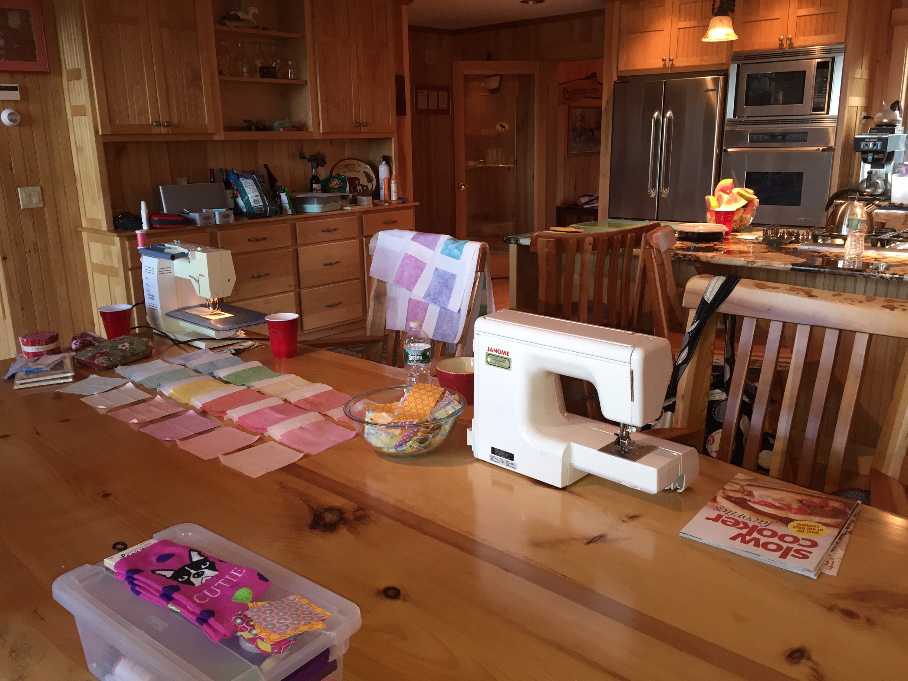 We are up in Rangeley, Maine for the week with the Greys. There is a lot is activity during the day boating, kayaking, swimming and such but at night the house is turned into a sewing studio.
