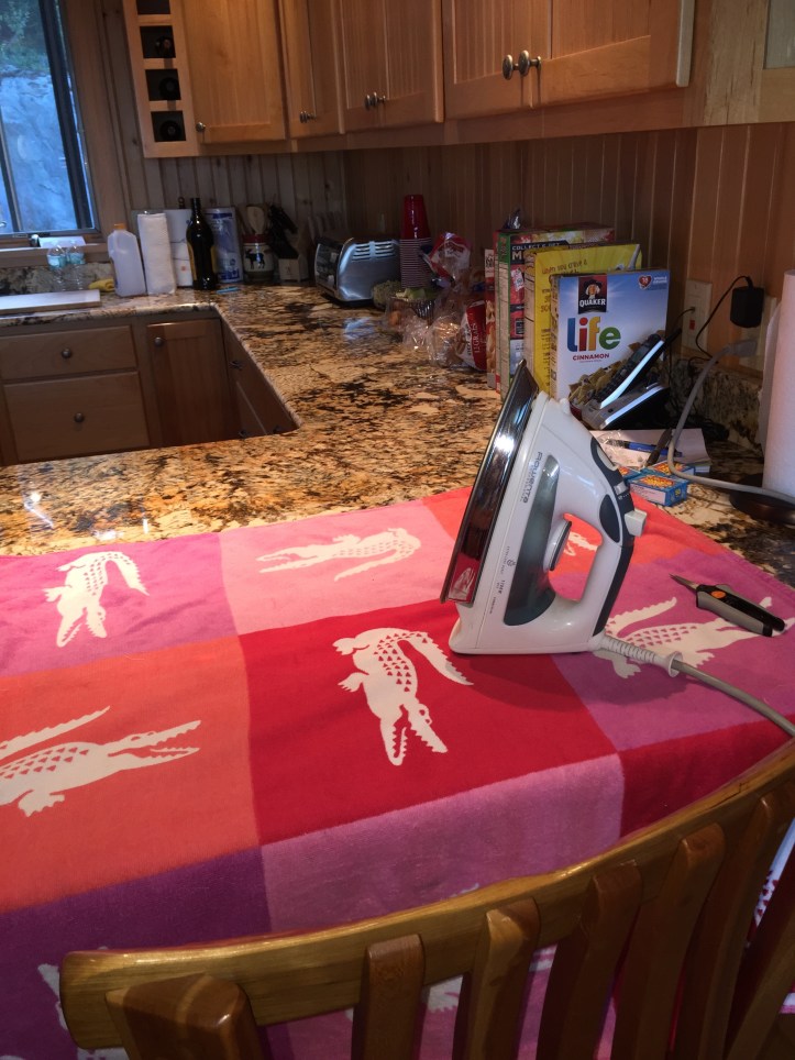The kitchen counter serves two purposes – cutting ad ironing of course.