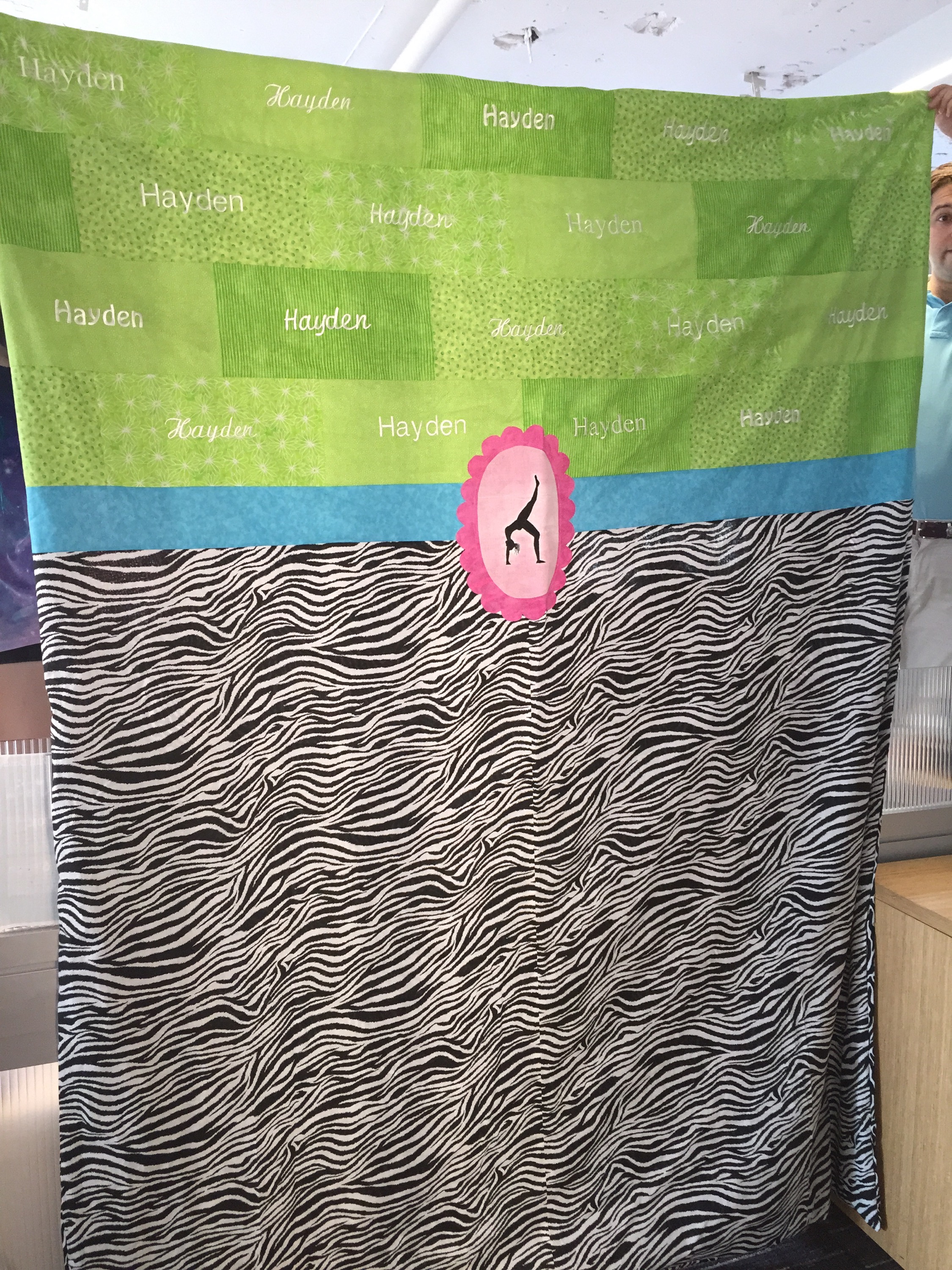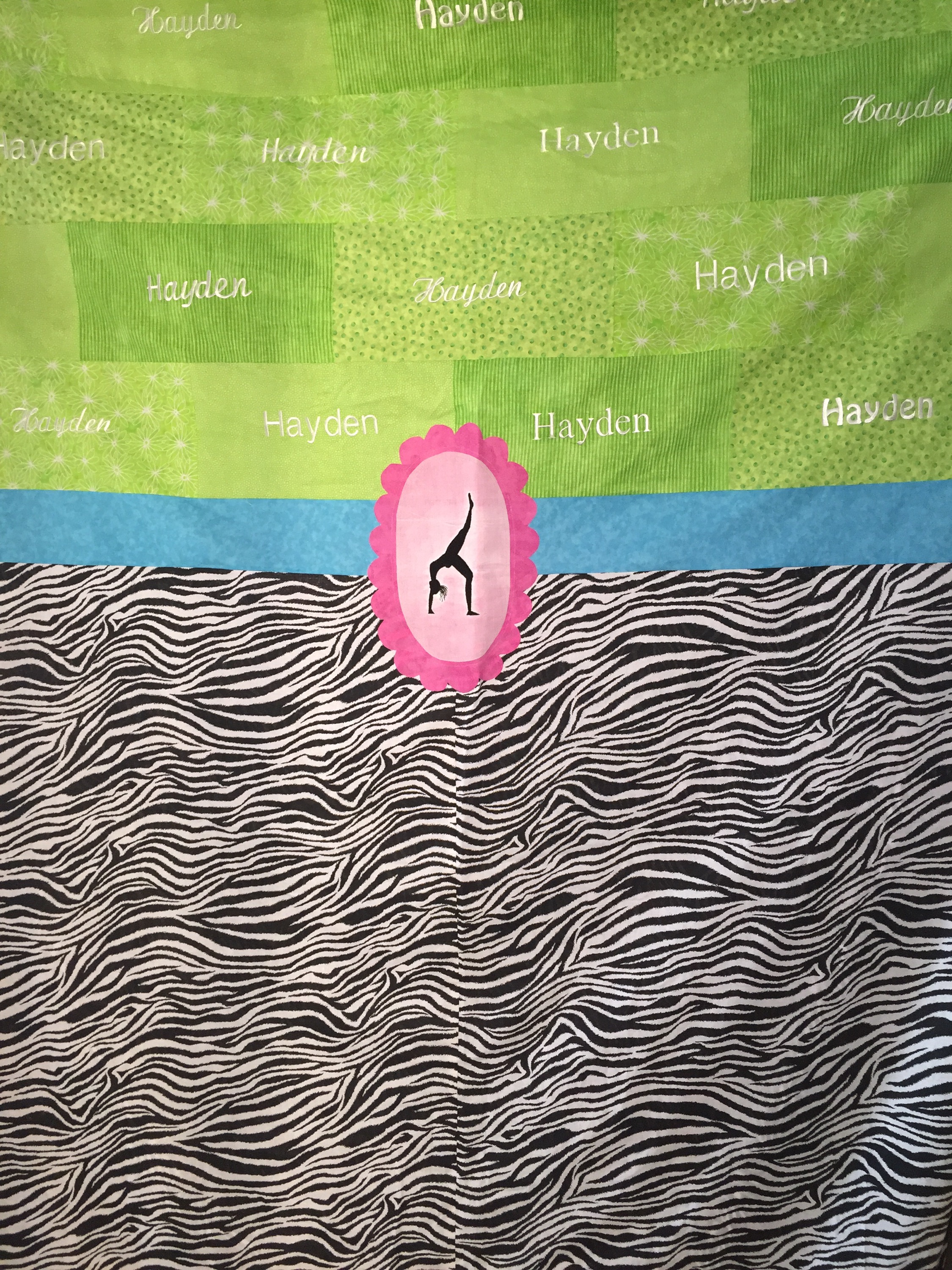 She knew exactly what she wanted and sent me a photo. I did a swatch board of fabrics and for a and then we were off. It is a twin size. The top is 18 embroidered Hayden’s in five fonts on four different fabrics. The gynnast medallion is embroidered, then attached with fusible web, and then stitched for extra stability. There is also a matching 24″x24″ pillow case that I made but forgot to photograph. I tried to get a photo so you could see the whole thing but it didn’t really work.
