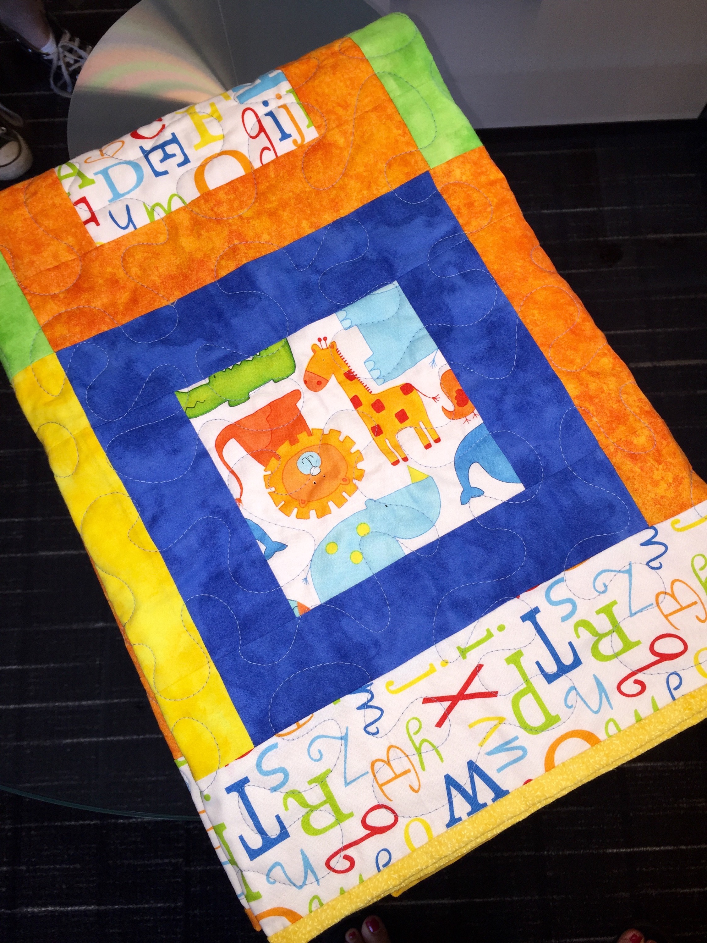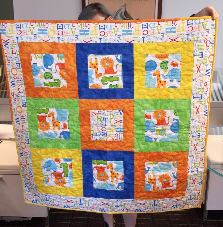 One of my real job clients just had a baby boy so my team got together and asked me to make him a quilt for his new son. I love this animal fabric and think it is especially cute with the letter fabric border.