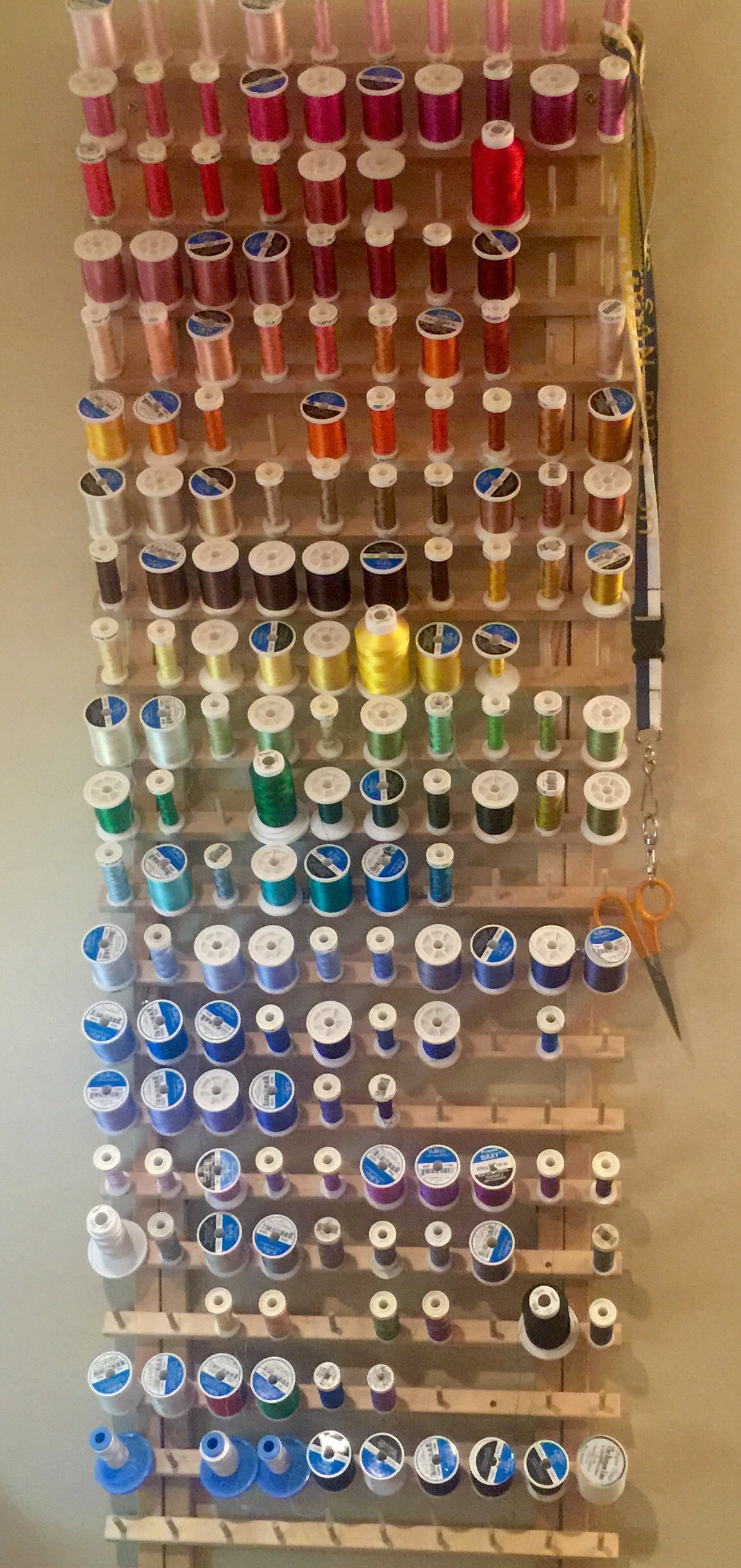 At the same time I got the new machine, we moved the sewing room from the loft to the lower level, creating a new and improved girl cave downstairs. More on that to come, but I do love my embroidery thread being so handy!