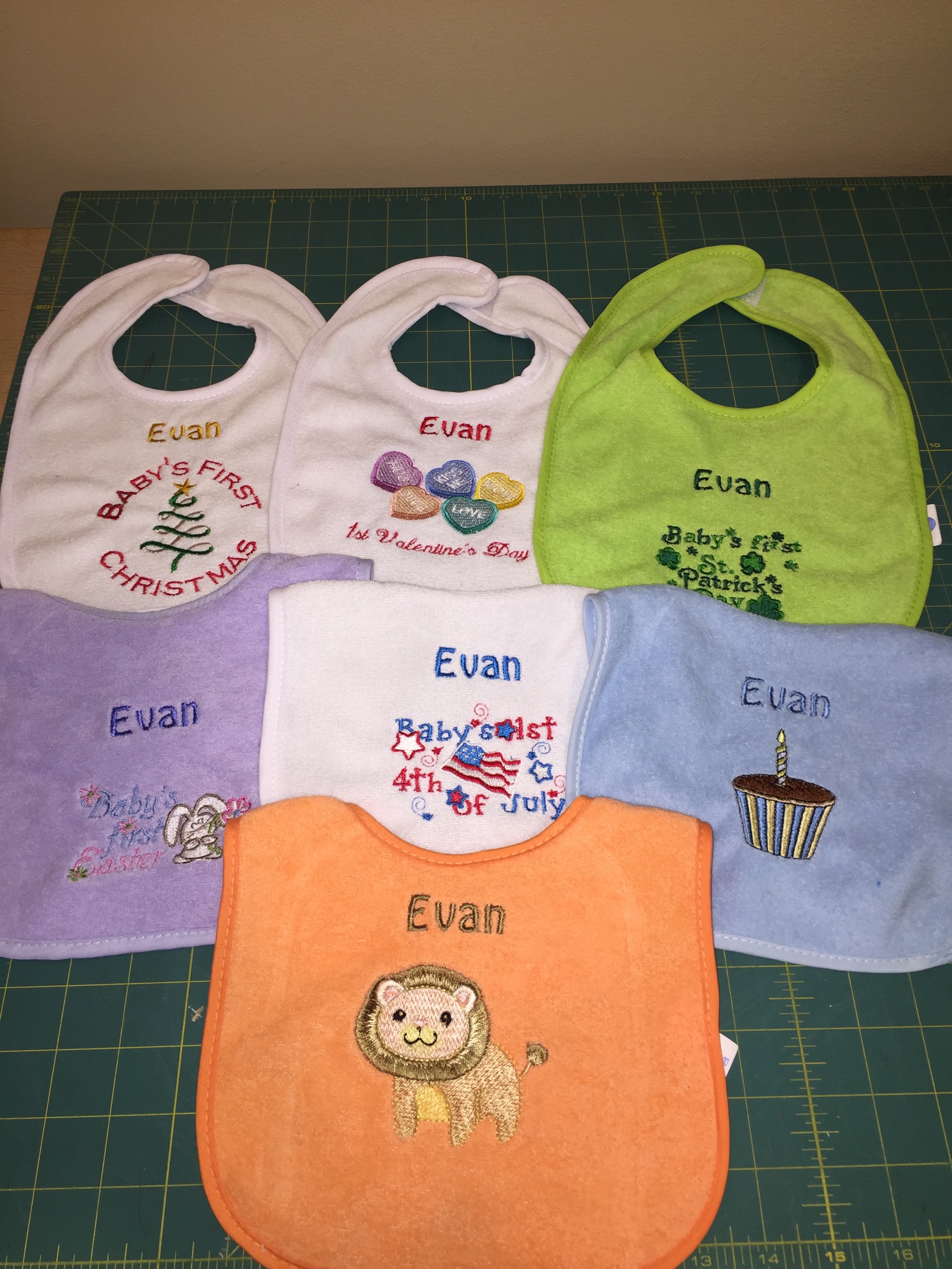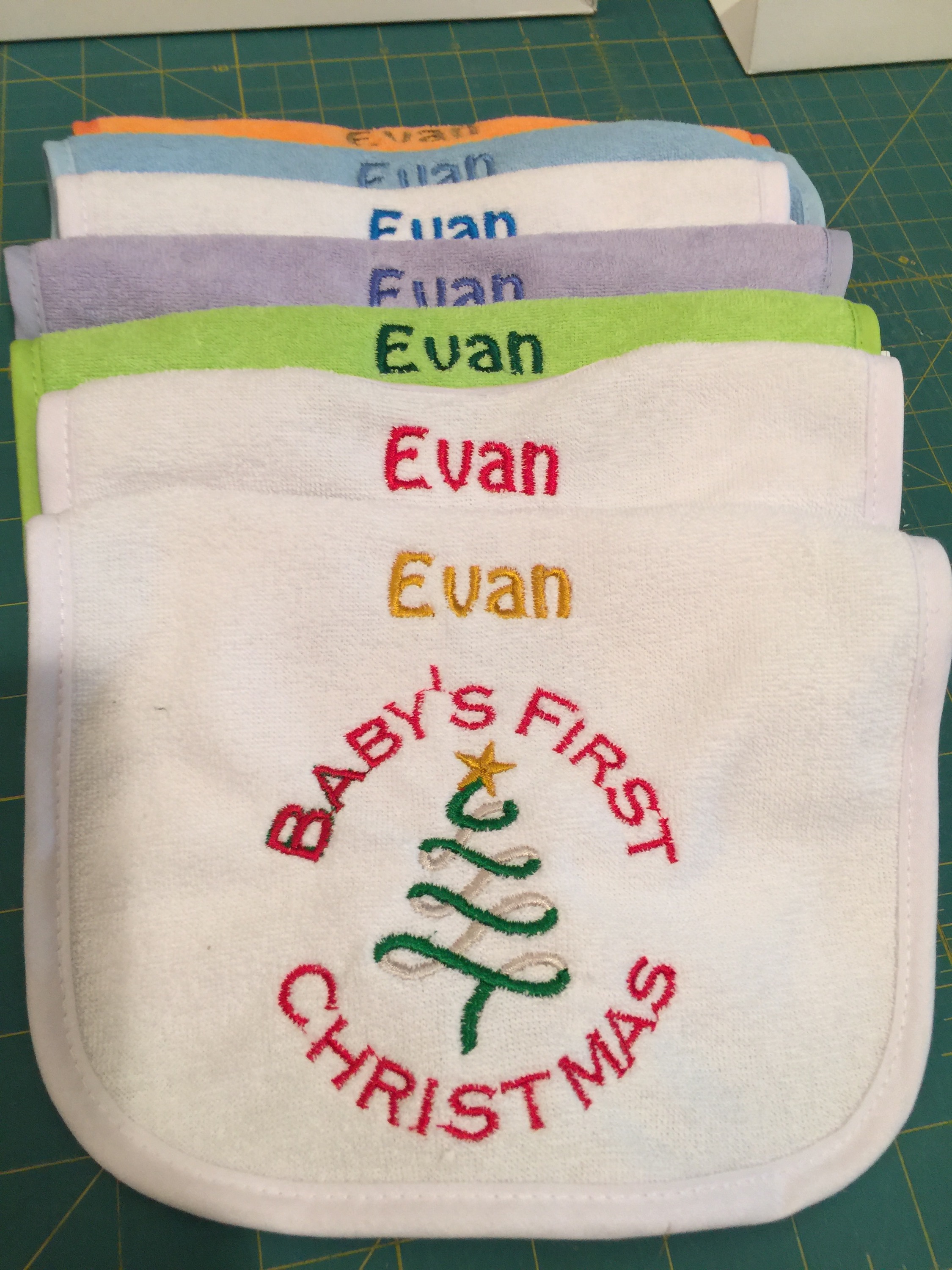 Bibs were a hot seller at the fall craft shows, with “baby’s first Christmas” leading the way. One of my regular customers had an idea to get a series of “baby’s first” bibs, and brought a friend.