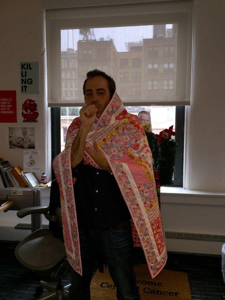 I wanted a playful quilt for Dave, and something a little larger than most baby quilts I made. Given Julia is the third of three, this toddler size quilt will allow her brother and sister to snuggle with her. Dave is a creative director, and worse yet on the art side, so I thought about doing something more modern and designed. But then again, it is still a baby quilt that will hopefully be well used and well loved (i.e. Spit on and a mess!) So, I took a simpler way out with this pattern that Jen shared. I actually did a teal version and the link version and the. Once Dave let me Kneille’s the baby’s room was pink and white made the decision which to gift them.