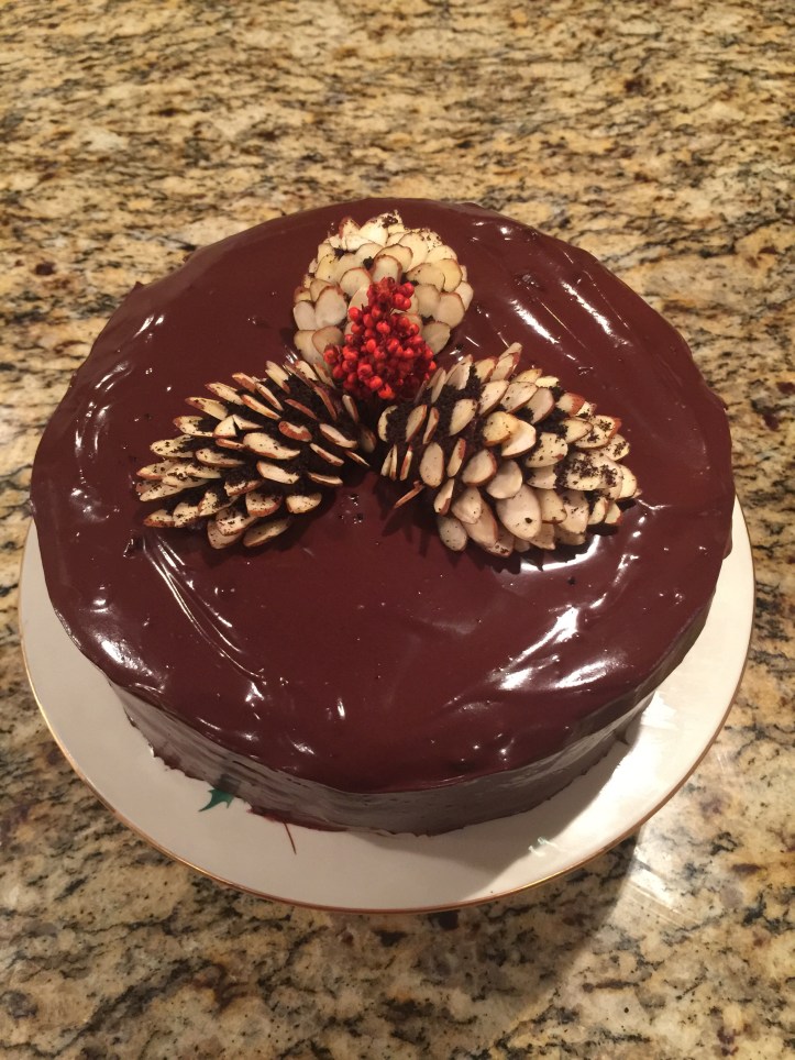 This is a twice-iced chocolate cake with mocha filling and frosting and then a ganache layer of icing. The pine cones are homemade chocolate truffles, almonds and cookie crumbs. Can’t wait to eat it later. It looks great on the beautiful Lenox holiday cake plate Jen got me for my birthday.