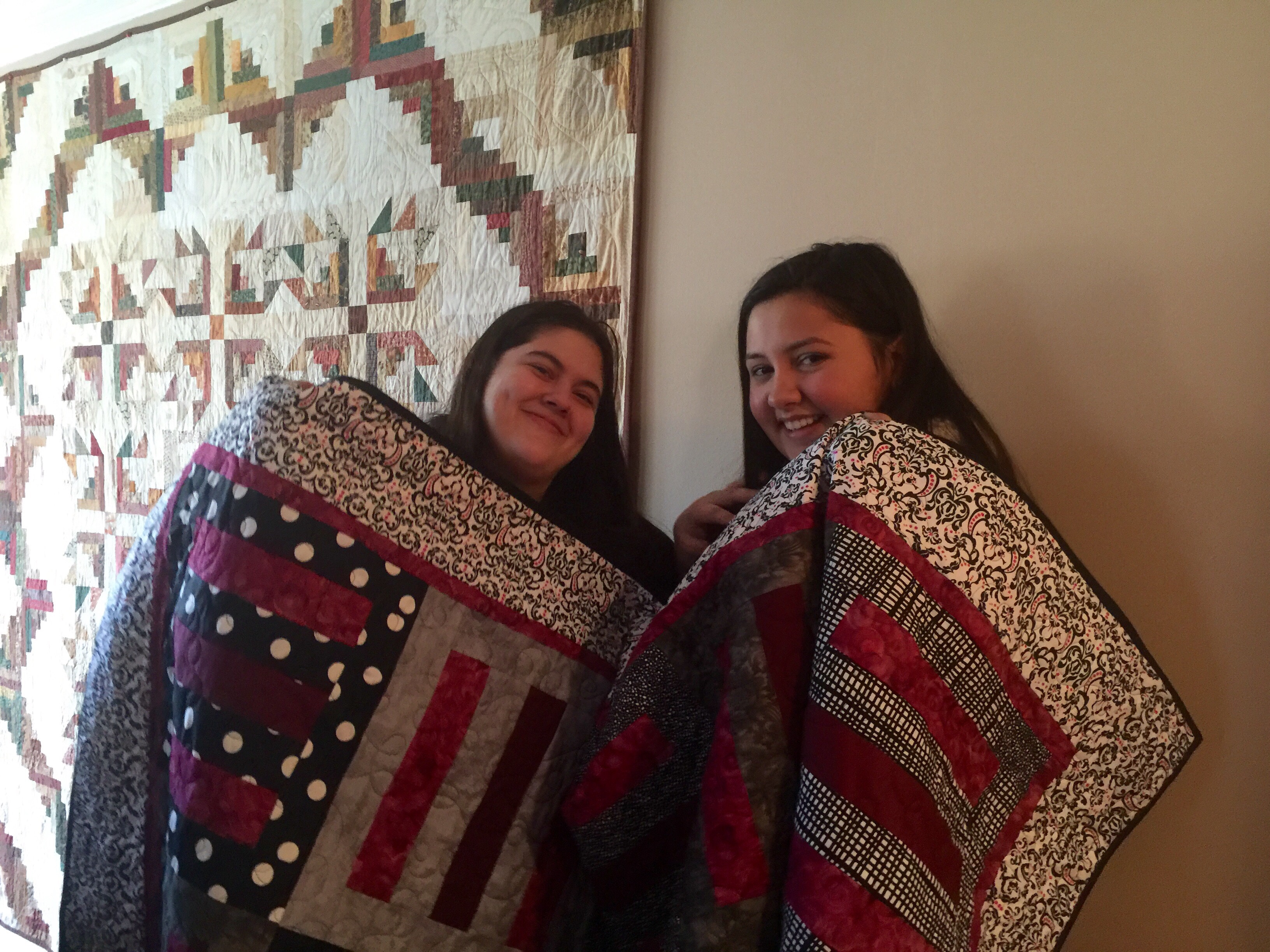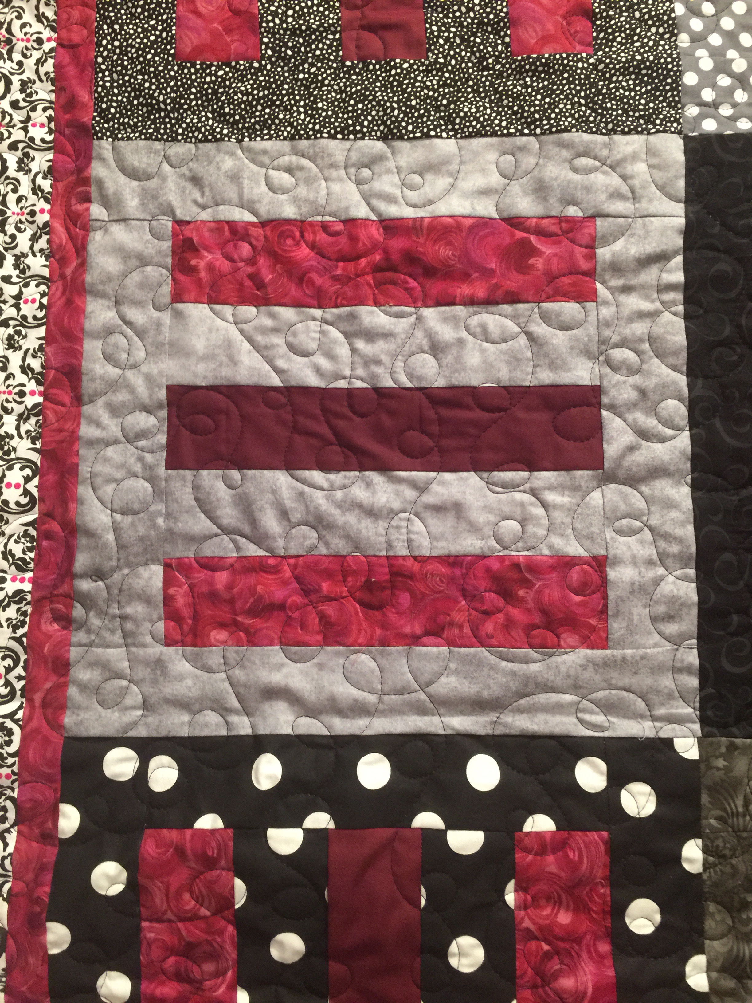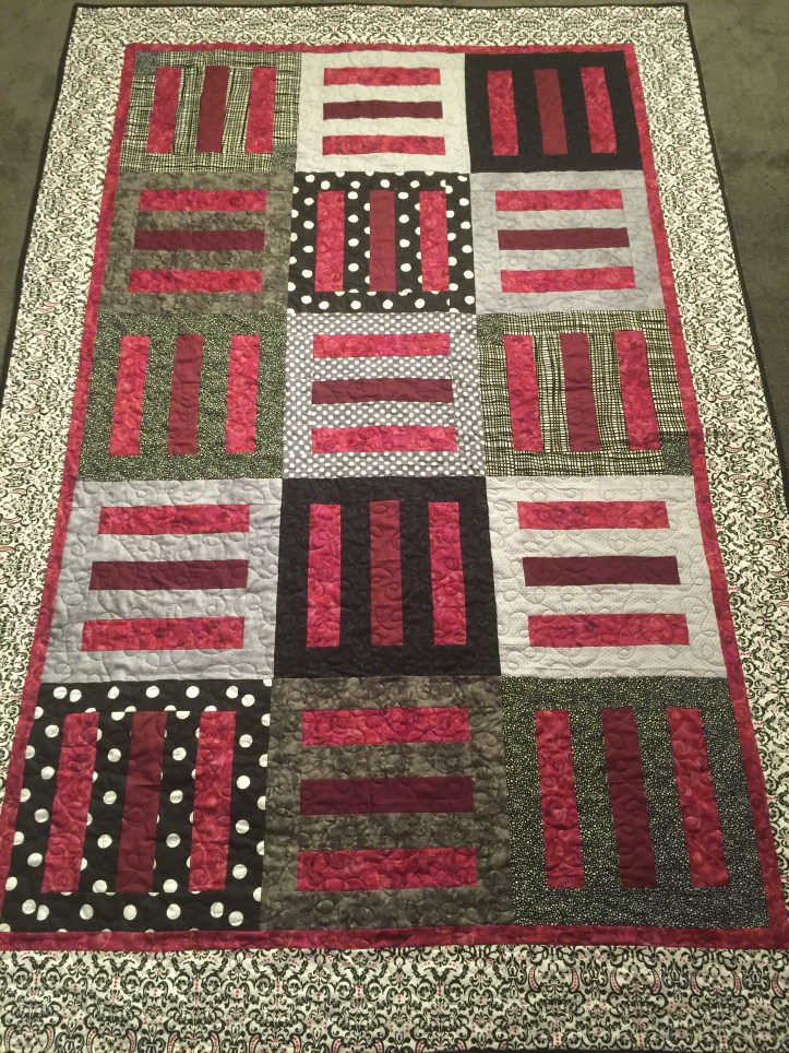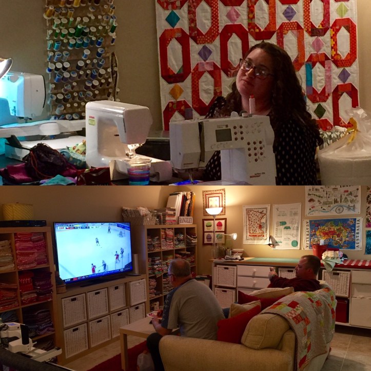 Jen worked on a beautiful batik quilt and started a new baby quilt, the guys watched hockey, and I raced to the finish line on my final handmade gift of 2015 – a new quilt for Kira. I last gave Maddie’s BFF a quilt around 2009-ish so I thought it was time for a new one. I actually had one cut out but then asked her mom what her color palette was these days. Suffice it to say that the brights I had started weren’t going to work with Kira’s palette of black, white, grey and maroon.