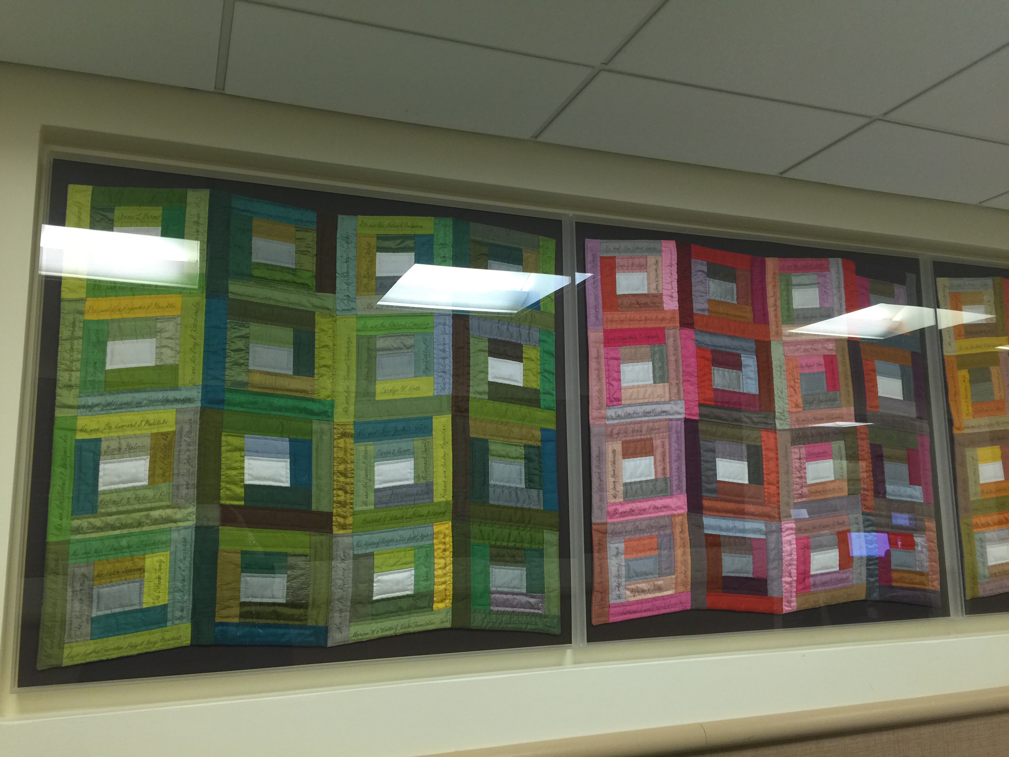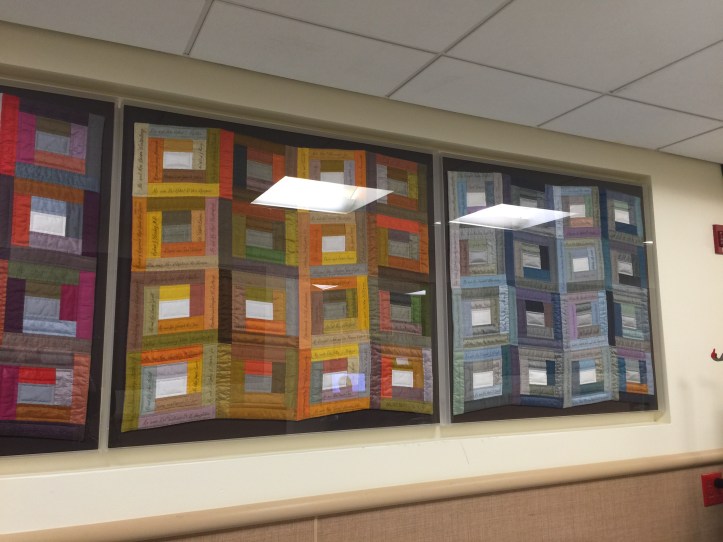 Ok, not everywhere. But sometimes in unexpected places. For example, I spent the better part of yesterday in the ER and the hallway that I was taken down to get from the ER entrance to my room had these four beautiful quilts on the wall. They were behind glass and each strip of the askew log cabins had a signature on them. The artist who created them used grey in all four to tie them together. I was looking for a plaque to learn the significance of the quilts and signatures but didn’t find one. The nurse didn’t know either which made me sad.