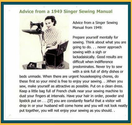 My mom had found this excerpt from a 1949 Singer sewing machine manual a year ago and shared it on Facebook. Facebook reminded me of it this week and I saved it to share here. It makes me laugh every time. Why would I waste time brushing my hair before going down to the girl cave to sew? And imagine worrying about Rob coming home and finding me not neatly put together, therefore causing me to enjoy my sewing less. I drag him down there with me!