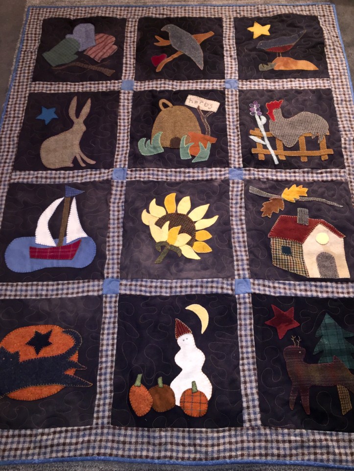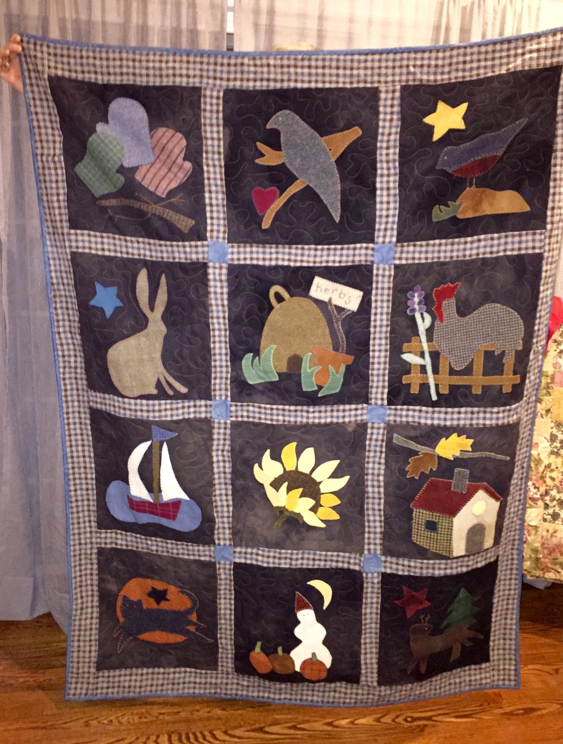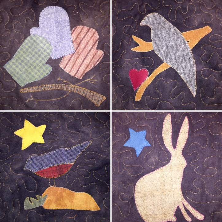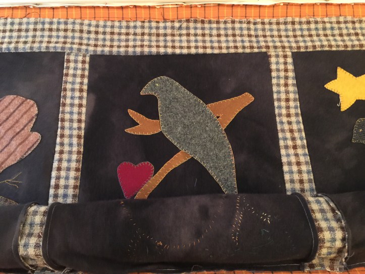 Each block was done on a 16″ canvas of felted wool with the shapes to complete the picture being done by hand. I really enjoyed doing it and actually completed the blocks as they were released. And then they sat. And sat. And moved around the sewing room. Until now. Maddie’s Dad loves folk art and always loved these blocks. So I decided to suck it up and finish this quilt as a birthday gift for him.