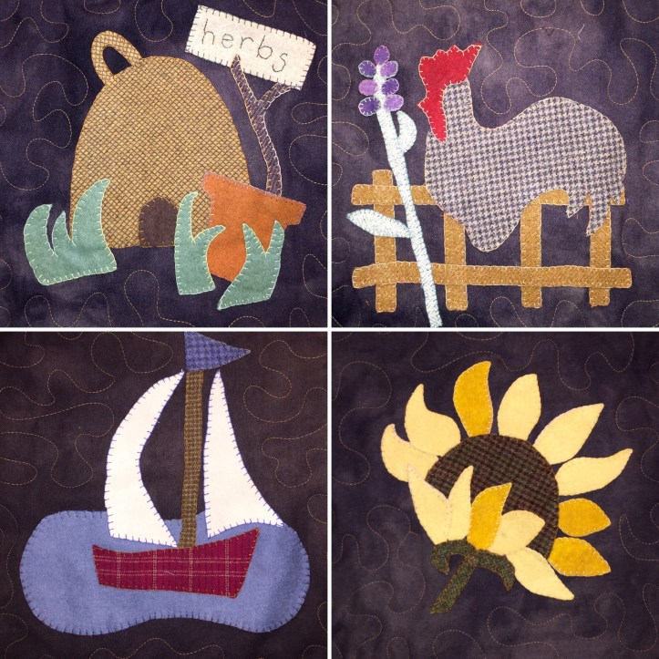 Moving into summer, here are the blocks for May through August. I love them all, but especially the sunflower. And I am relieved that the “herbs” handwork came out ok as I haven’t done that sort of sewing in years.