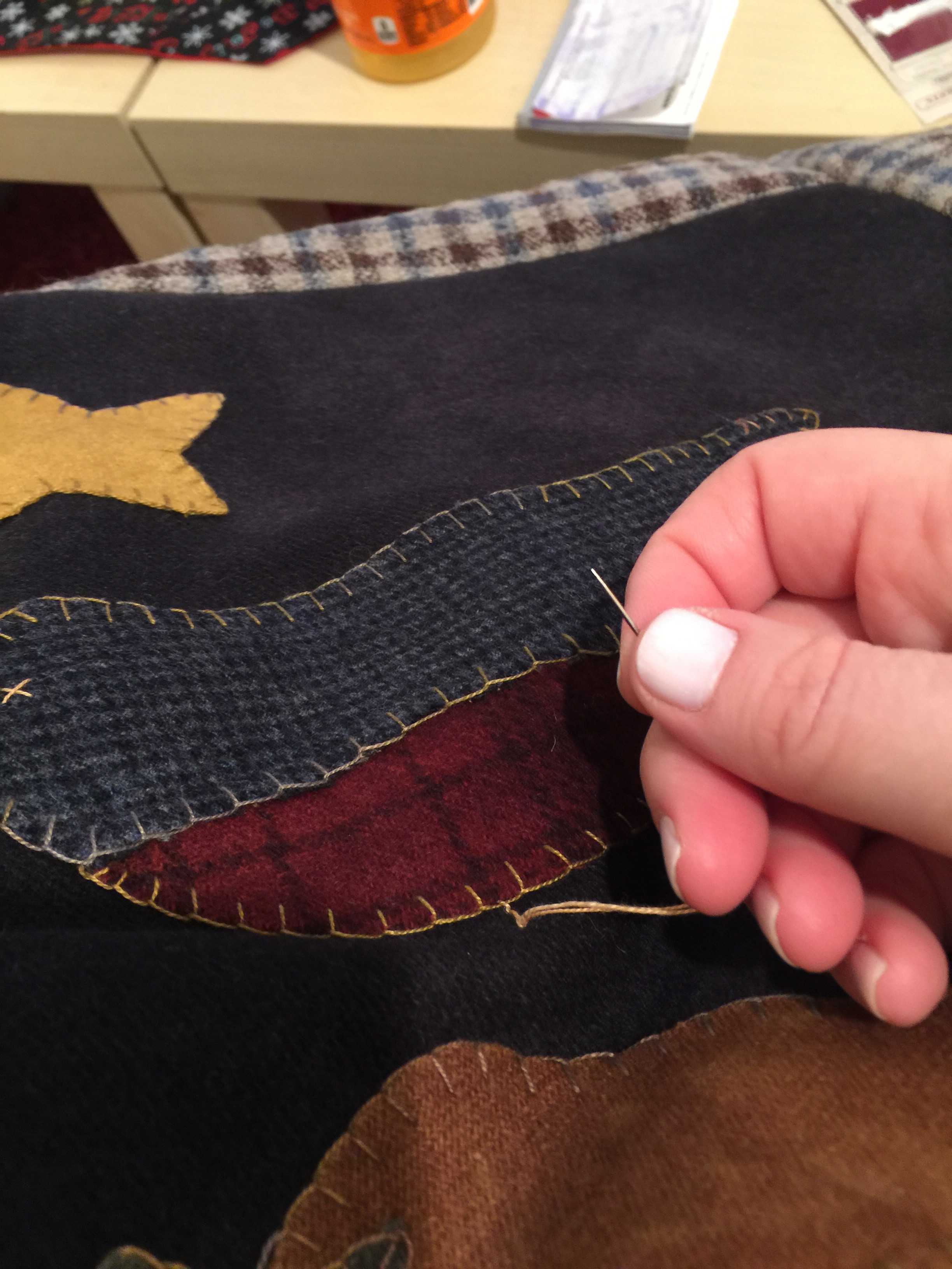 I laid it out and decided to do a plaid wool sashing with solid blue cornerstones on the interior of the quilt. That part was somewhat difficult as the wool sashing had a lot of give to it. I then loaded it onto the longarm machine. This too was a challenge as the wool is so stretchy. If I were to do another wool project I would probably use interfacing to stabilize the blocks – similar to how I make tee-shirt quilts. I decided on a warm tan thread and a simple freehand meandering pattern and did NOT quilt over the handwork.