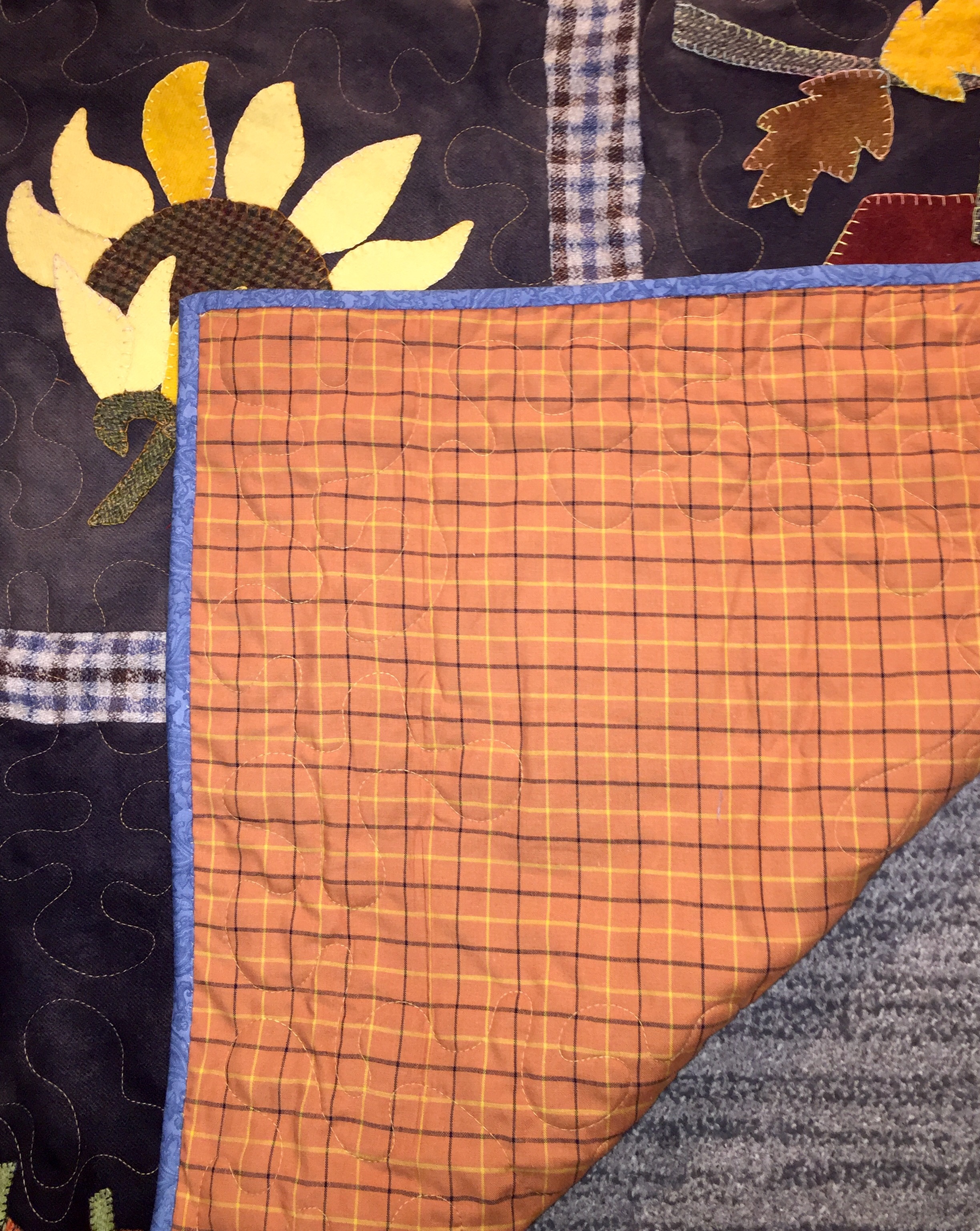 I did a warm orange flannel on the back. It is probably not the best color choice, but I pulled it from my stash. And it is soft. π