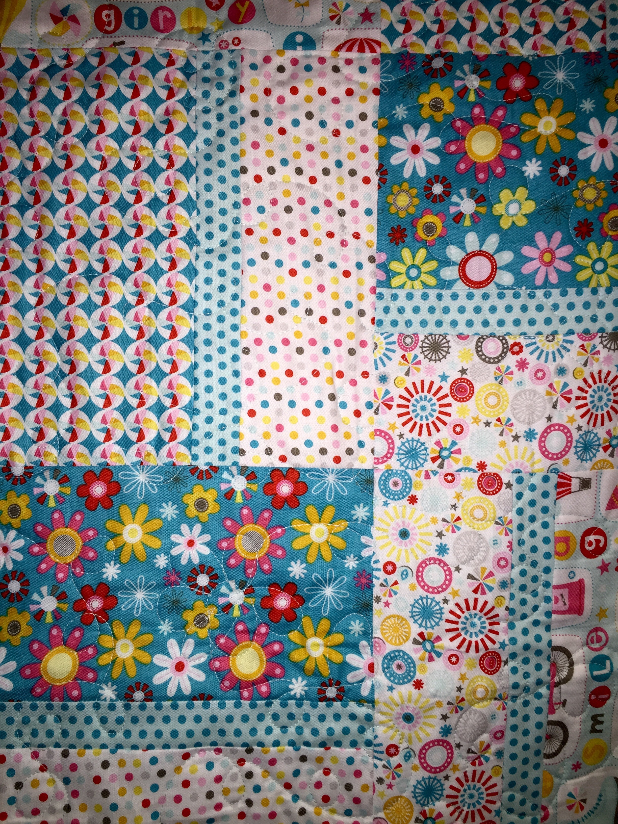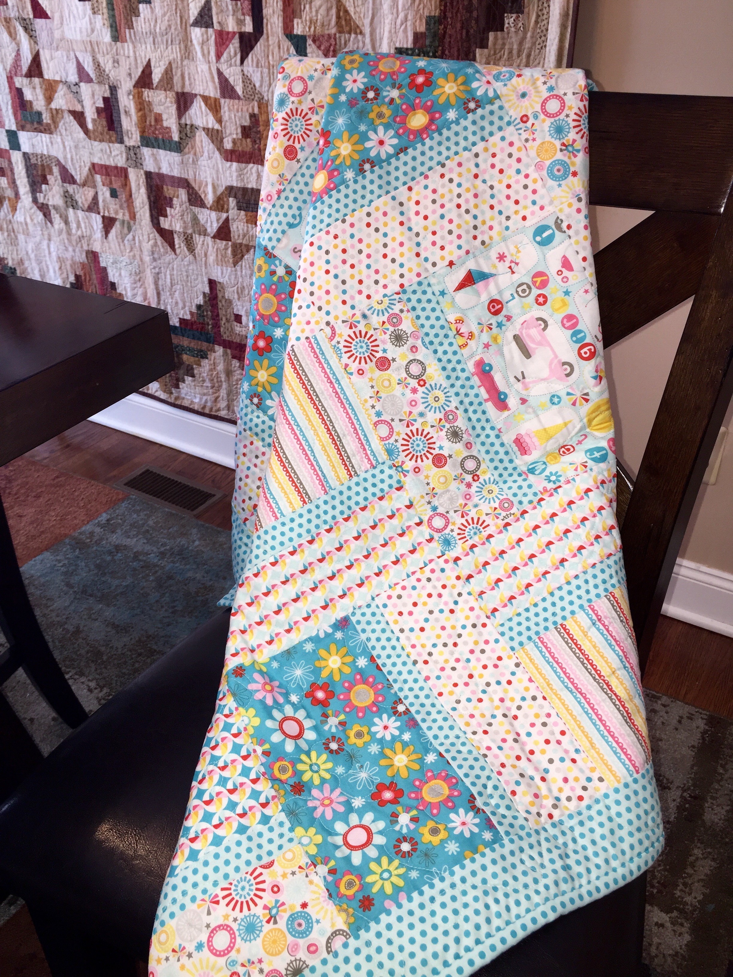 The quilting is what I do fastest – freehand loops and swirls. I feel like my longarm quilting itself is in a rut so I have two quilts on the machine now that I am doing pantographs on. I love the colors of this quilt – girly without being sappy, bright without being obnoxious and just generally happy shapes and icons of childhood. Last night was so busy for them that I wasn’t able to see Leela open it, but I did get messages last night from both of them that they love it. I hope Molly Rose does too. Now go get Tom’s book!