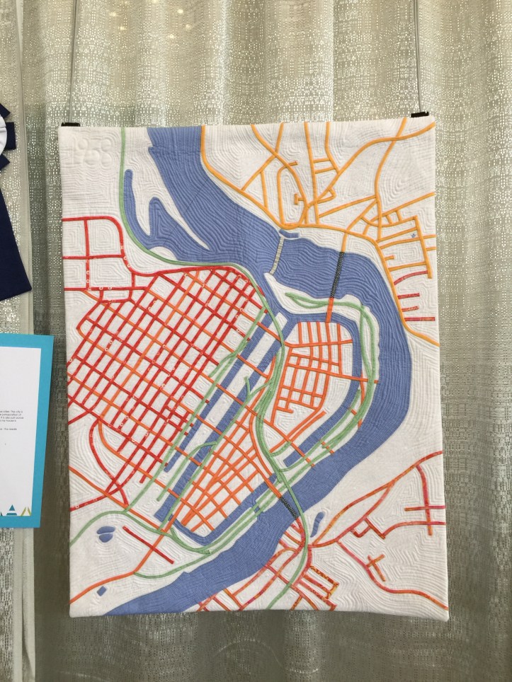 This quilt, “Holyoke 1938” by Timna Tarr (@timnatarr) represents an early map of one of America’s first planned cities. I found it really pretty, and obviously complex to make. The won a ribbon in the Small Quilts category, but I don’t remember which place.
