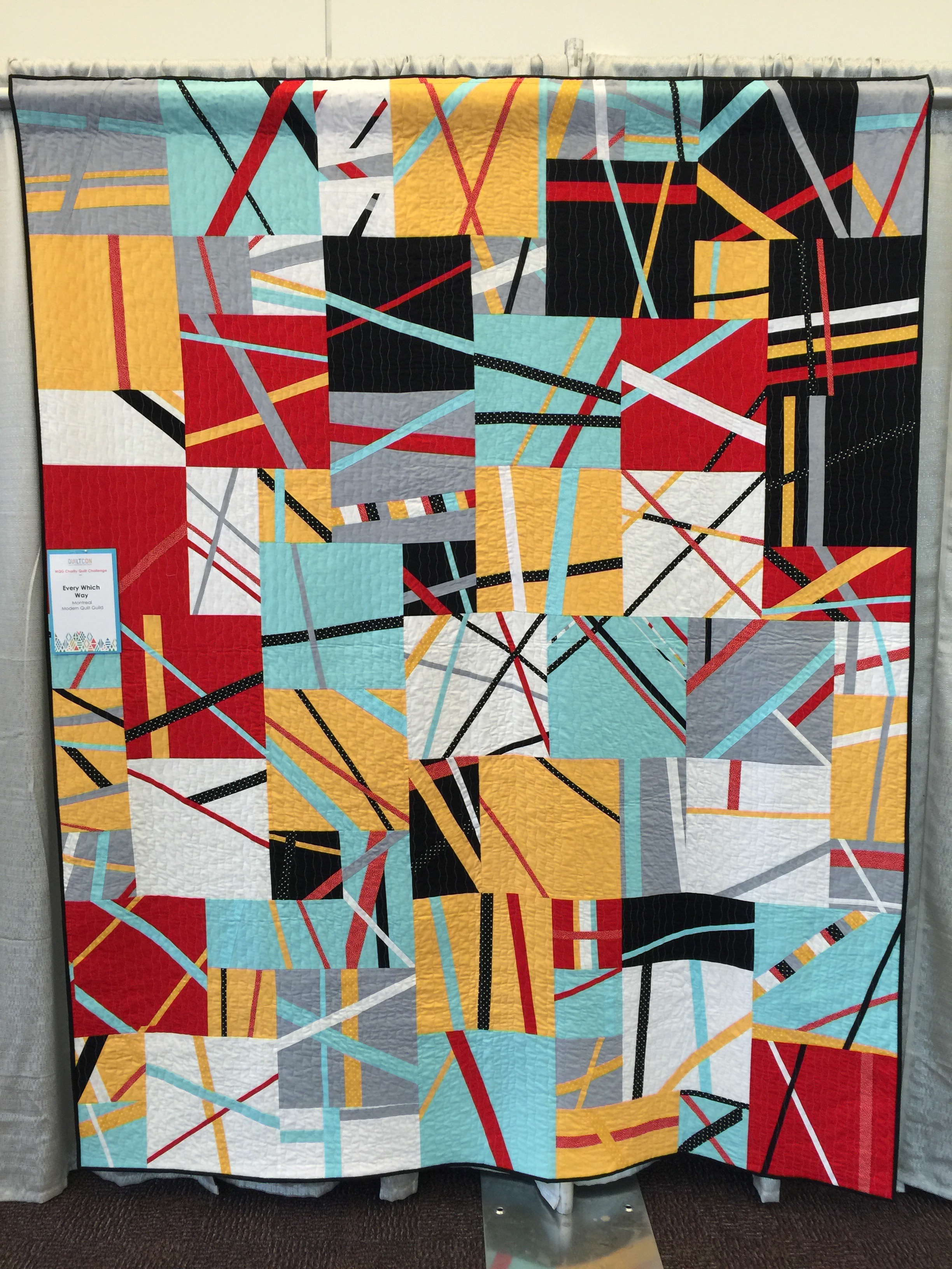 Beyond the amazing quilts and quilting that I have shared so far, there was also an exhibit of quilts made by Modern Quilt Guilds as a charity challenge. You can learn more about the Challenge here: http://quiltconwest.com/get-involved/member-charity-challenge/ but essentially guilds were challenged to use a color palette combining sunflower yellow, tomato red and teal with off-white, grey and white. Some of these quilts were real standouts and could have been in the main show IMHO.
