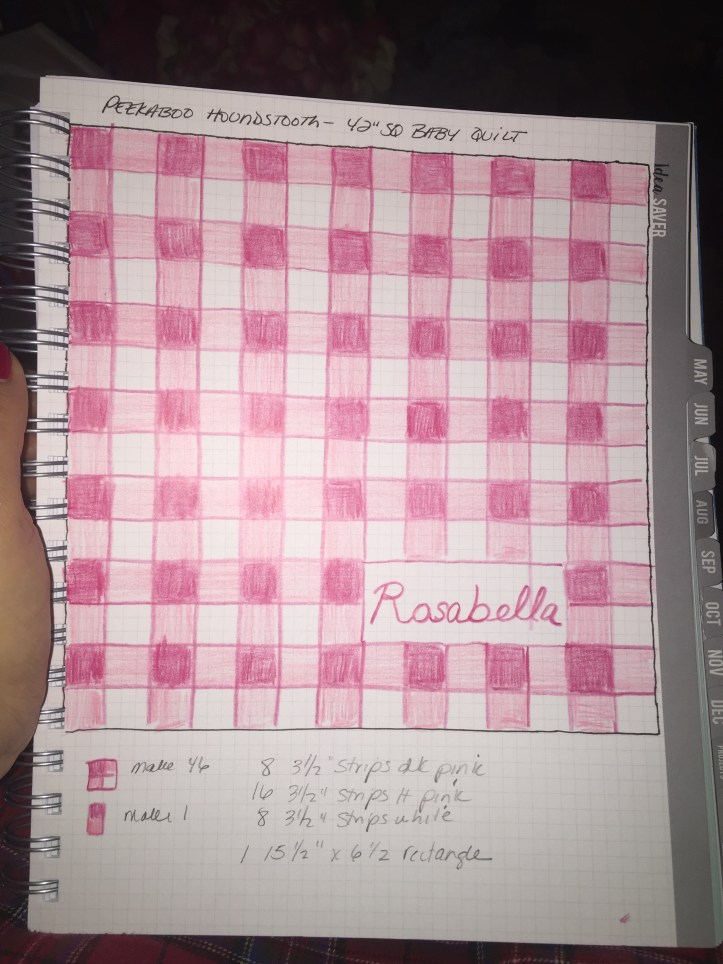 Since I still can’t get down to the sewing room I decided to sketch it out and figure out the math. I am going to use 3.5″ strips/squares and the quilt will be 42″ square when finished. I left a 15.5″ x 6.5″ cut out to embroider the baby’s name – in this case Rosabella.