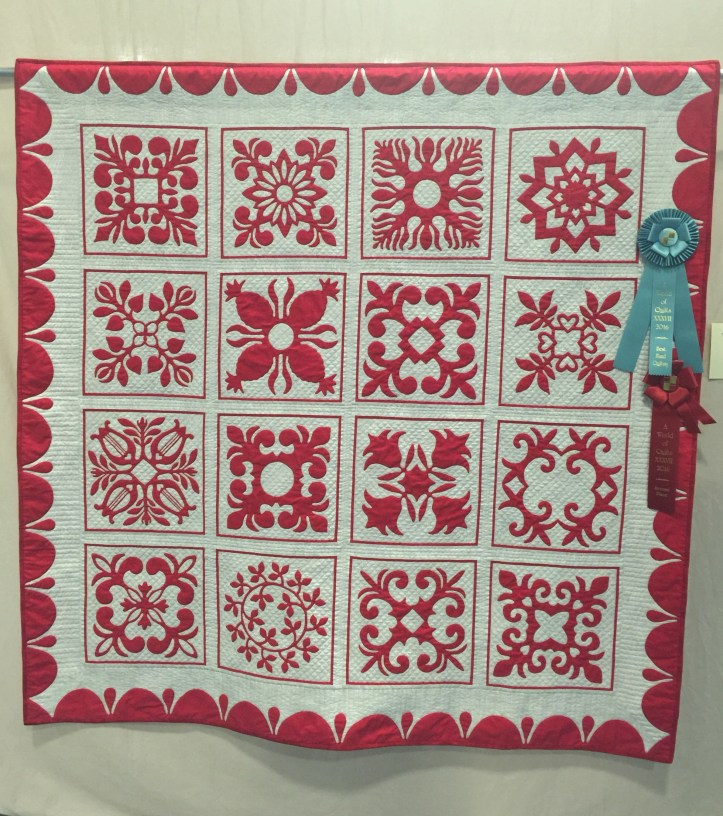This is “Anne’s Wish” by Noreen Graham. She made it for her daughter who always wanted a red and white quilt. It is, as were most of the quilts in this show, much more traditional than what I gravitate toward, but I really appreciate the striking nature of this quilt. The precision of the work and the quilting were amazing. Congratulations to Noreen on her ribbons.