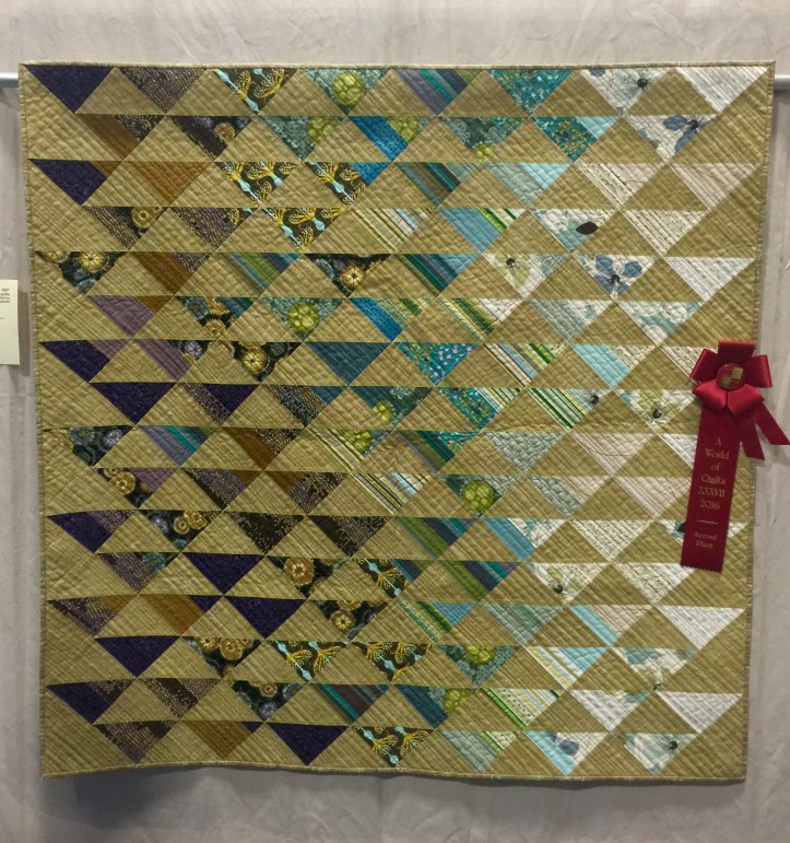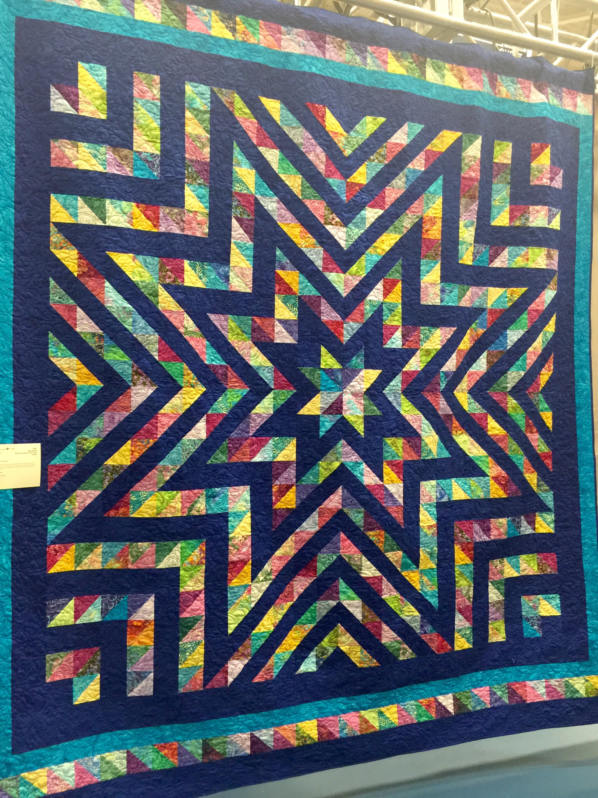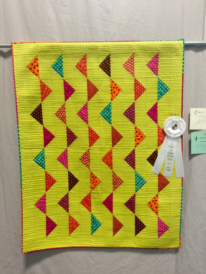 Staying with triangles for a moment, this is “Dots Wasabi” by Karen Carlson. She won a Judges Choice Ribbon. I admire her courage for using such a strong color for the background. It really worked and was playful alongside the polka dots. It was one of the more modern quilts I saw and I really liked it a lot.