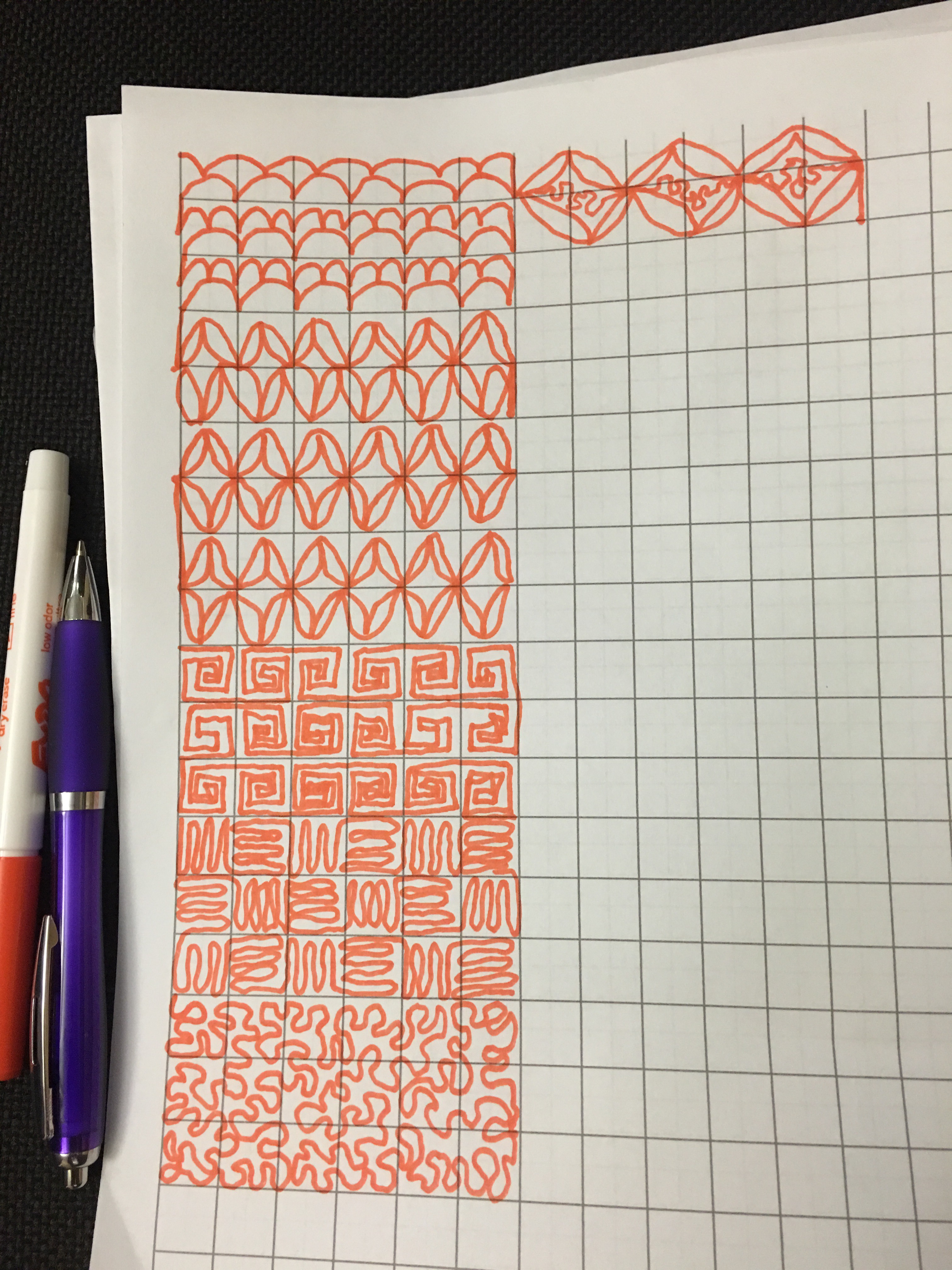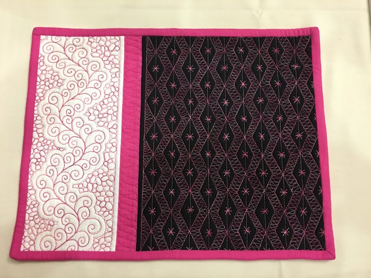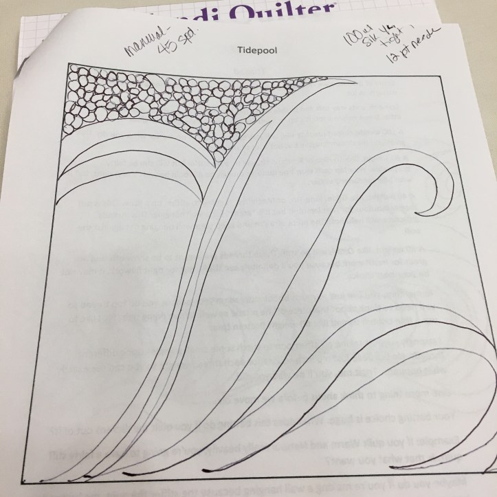 “From Blah to Rah Microquilting hands-on” was all about using very fine quilting, called microquilting, to add massive visual interest to quilts. The instructor, Kerri Rawlins, took us through several options and had us practice drawing them before setting us loose on the machines. This was helpful, and is something I often do at home to get into a rhythm with something I plan on free-motion quilting.