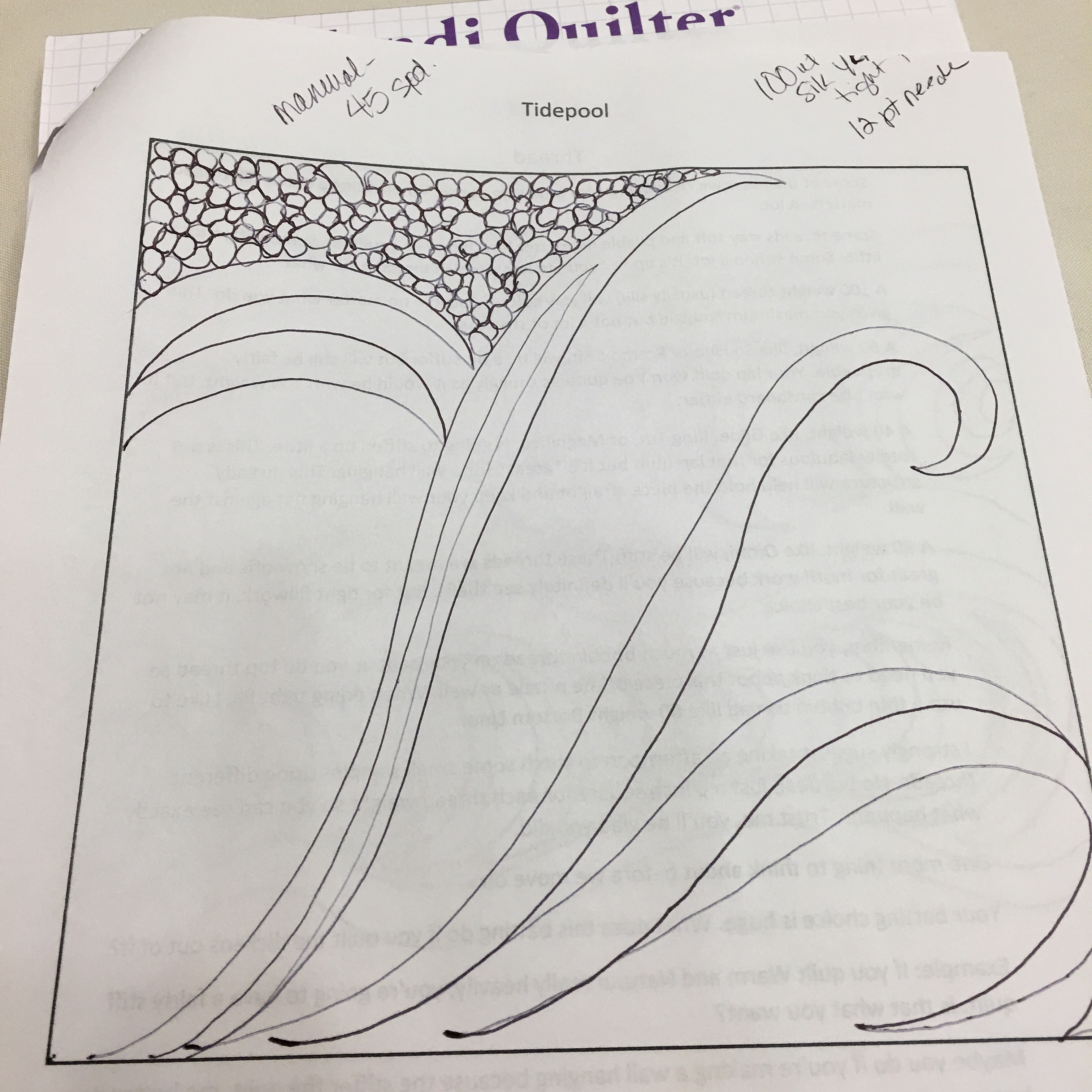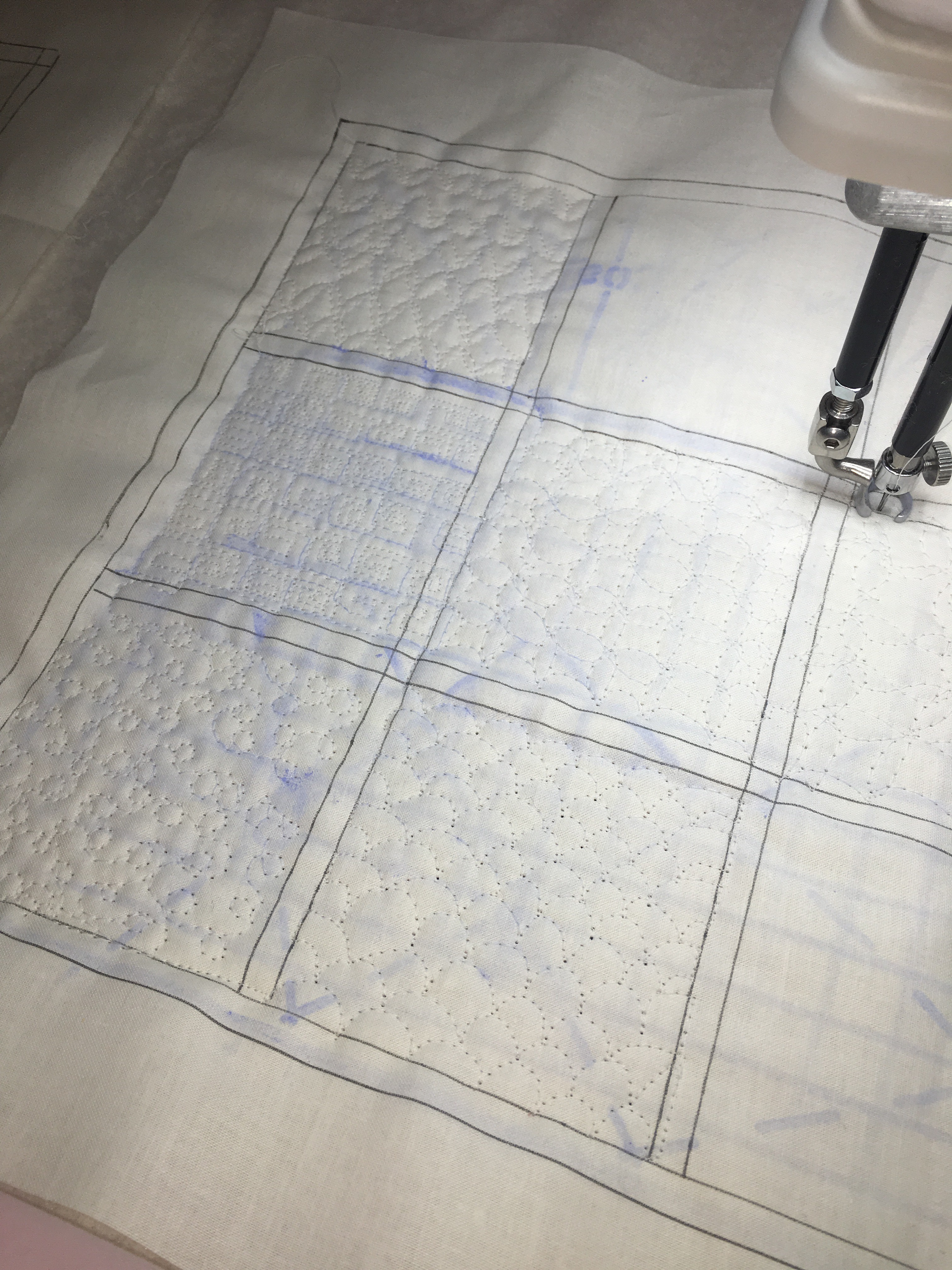 After drawing for a bit, we practiced on the machines. I learned about grid templates and pounce chalk to mark the quilt for quilting so you could create these intricate, but simple designs. Who knew? Clearly I need some practice. Oh, I also learned you can sit when microquilting. Bonus!