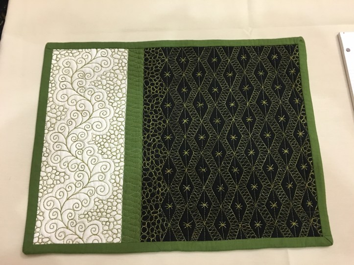 This is the first in the series. She talked a lot about wanting to improve her transition between quilting in the different pieces, and also about the different way the green thread represents on the white, green and black fabric.