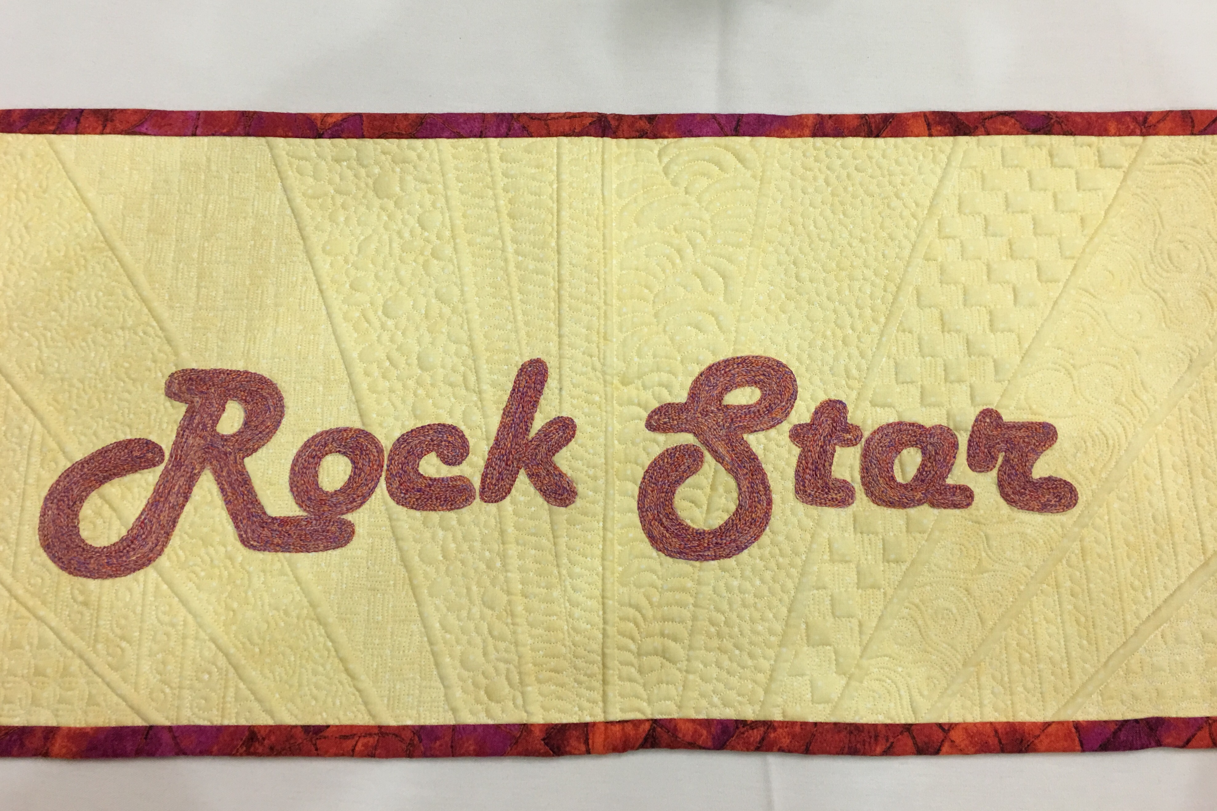 She shared several other intricately quilted quilts, including some that use thread painting to make letters. She said that she threads a #20 needle with three different threads to get the bulk and coverage. She also talked about using two or three layers of batting to get loft in the front and so that clear space puffs out. I will try that.