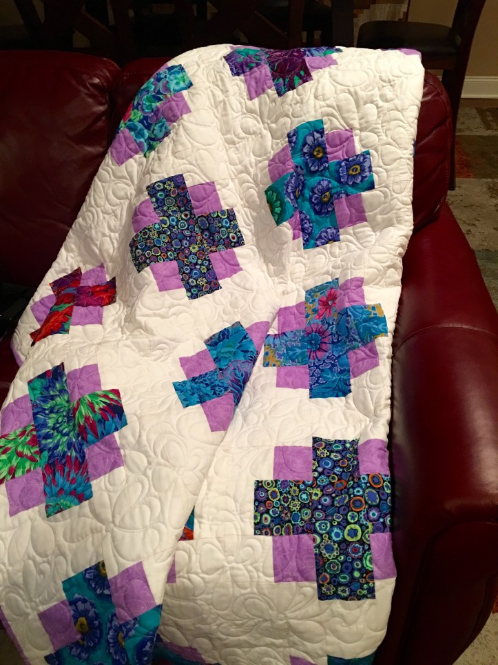 We knew Maia’s favorite color was lavender. So I pulled a FQ pack of Kaffe Fassett prints and a coordinating lavender from my stash, deciding to do the corners in the same color to tie the quilt together. The background is kona white and the back is the same lavender. I ended up cutting 16 fat quarters, although I only probably needed 5. So, in addition to Maia’s quilt, I have 36 more blocks done!