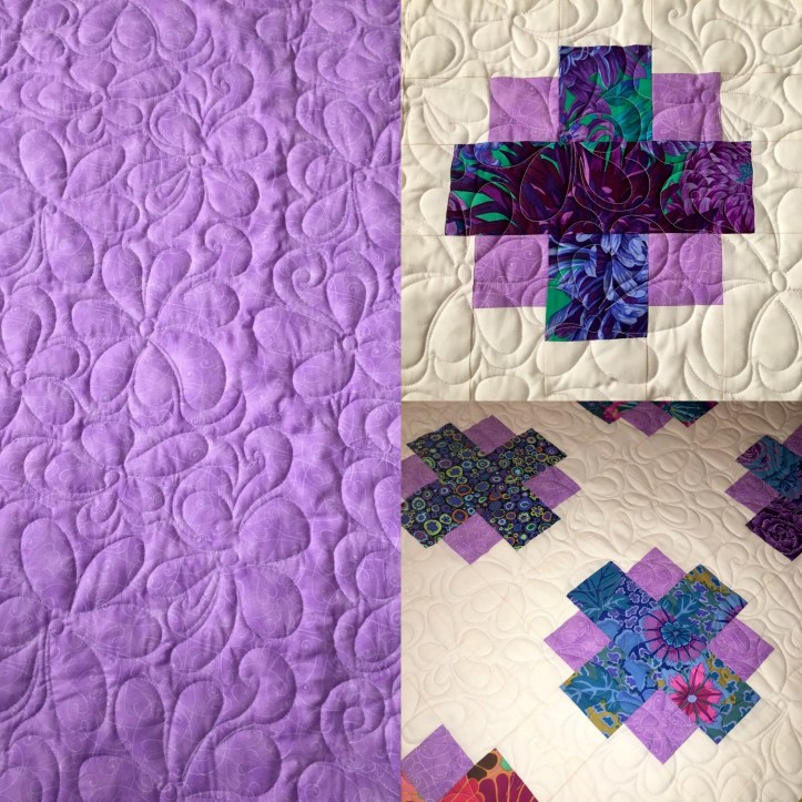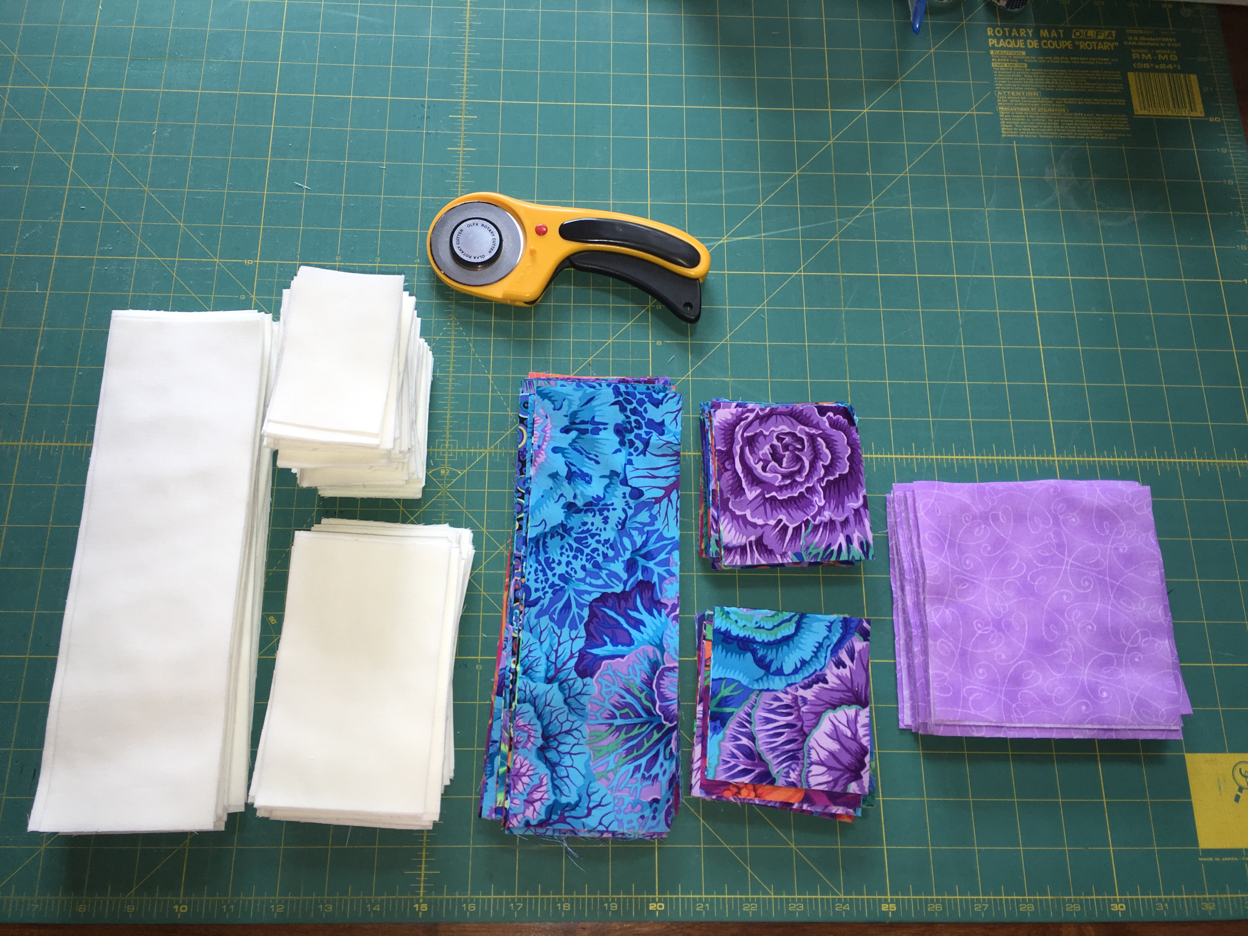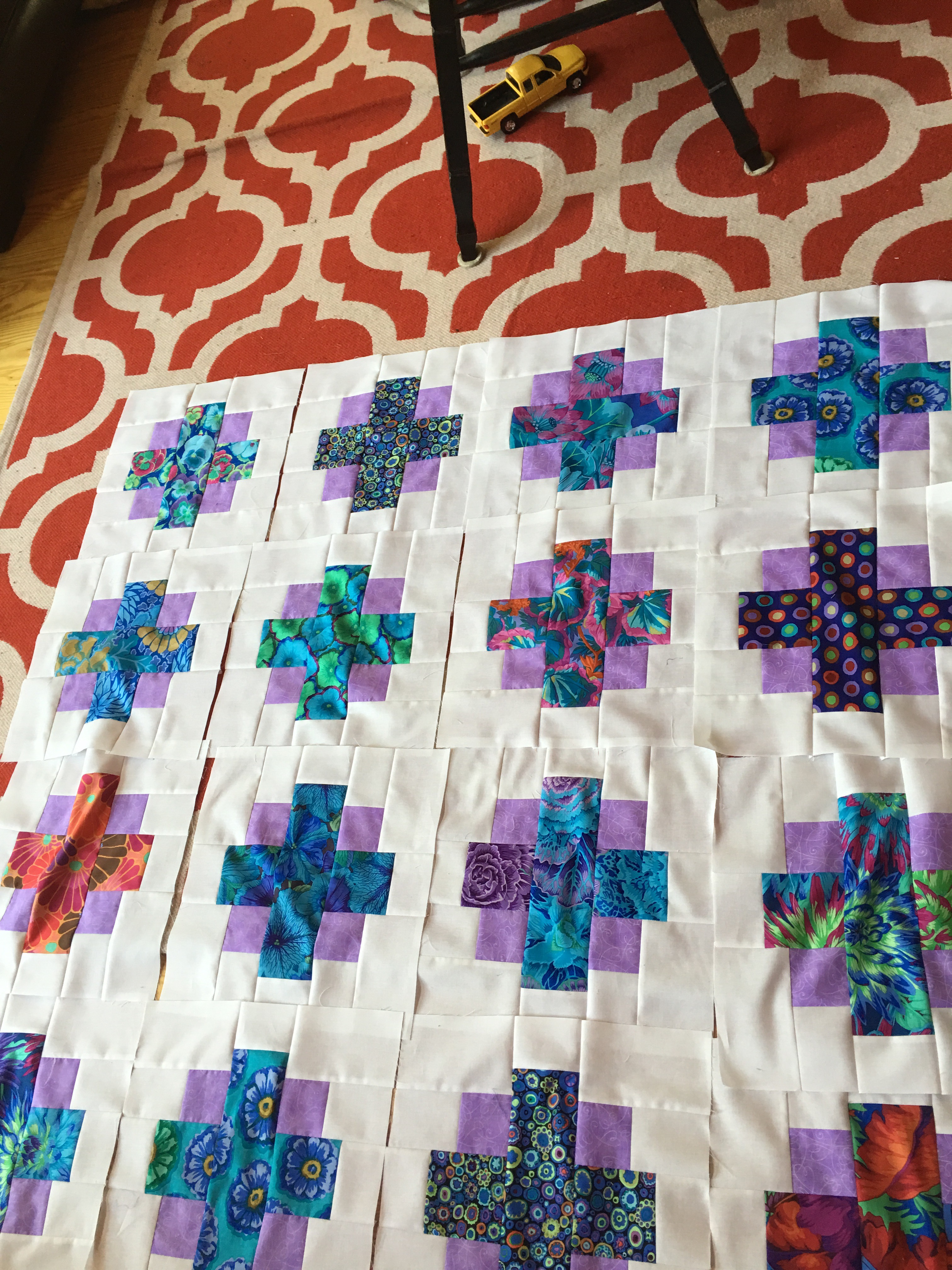 We knew Maia’s favorite color was lavender. So I pulled a FQ pack of Kaffe Fassett prints and a coordinating lavender from my stash, deciding to do the corners in the same color to tie the quilt together. The background is kona white and the back is the same lavender. I ended up cutting 16 fat quarters, although I only probably needed 5. So, in addition to Maia’s quilt, I have 36 more blocks done!