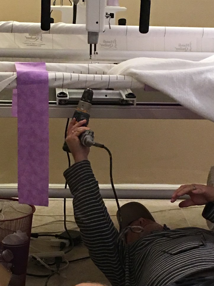 Yep, that is my husband, on the floor, under my machine, with a drill. Turned on. Pointed at my machine. Turns out the finger that holds the bobbin basket in place had loosened so he had to loosen it and put the bobbin back in place. Fortunately Alan from Quilter’s Basket in Pawling NY texted us through it. That was close!