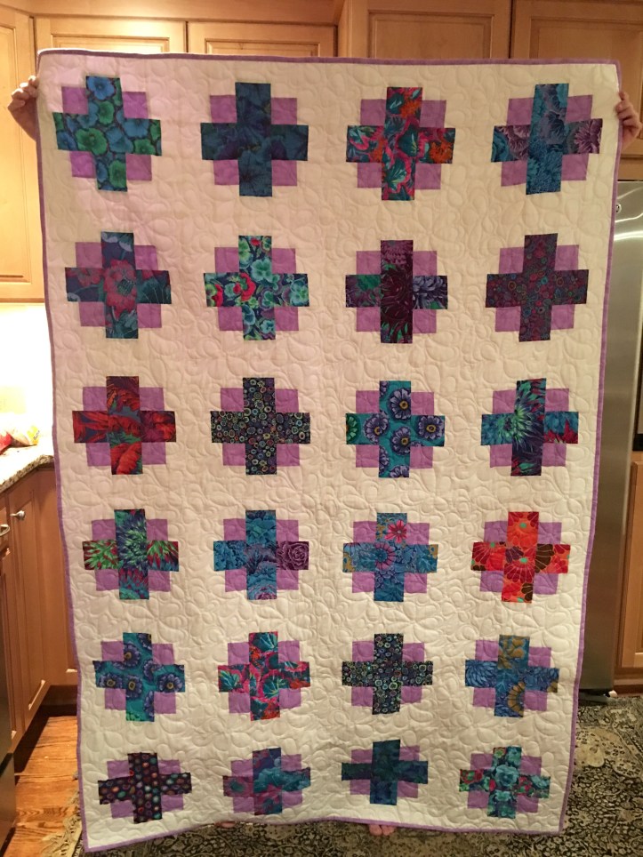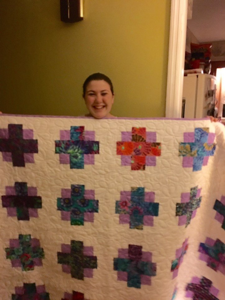 My love affair with the Easy Addition quilt started at QuiltCon on February. I knew I wanted to make one (or twelve) but the recipient had to be worthy. And would have to appreciate it. Then one of Maddie’s BFF’s graduated high school and is headed off to Babson this week – and she wanted a quilt!
