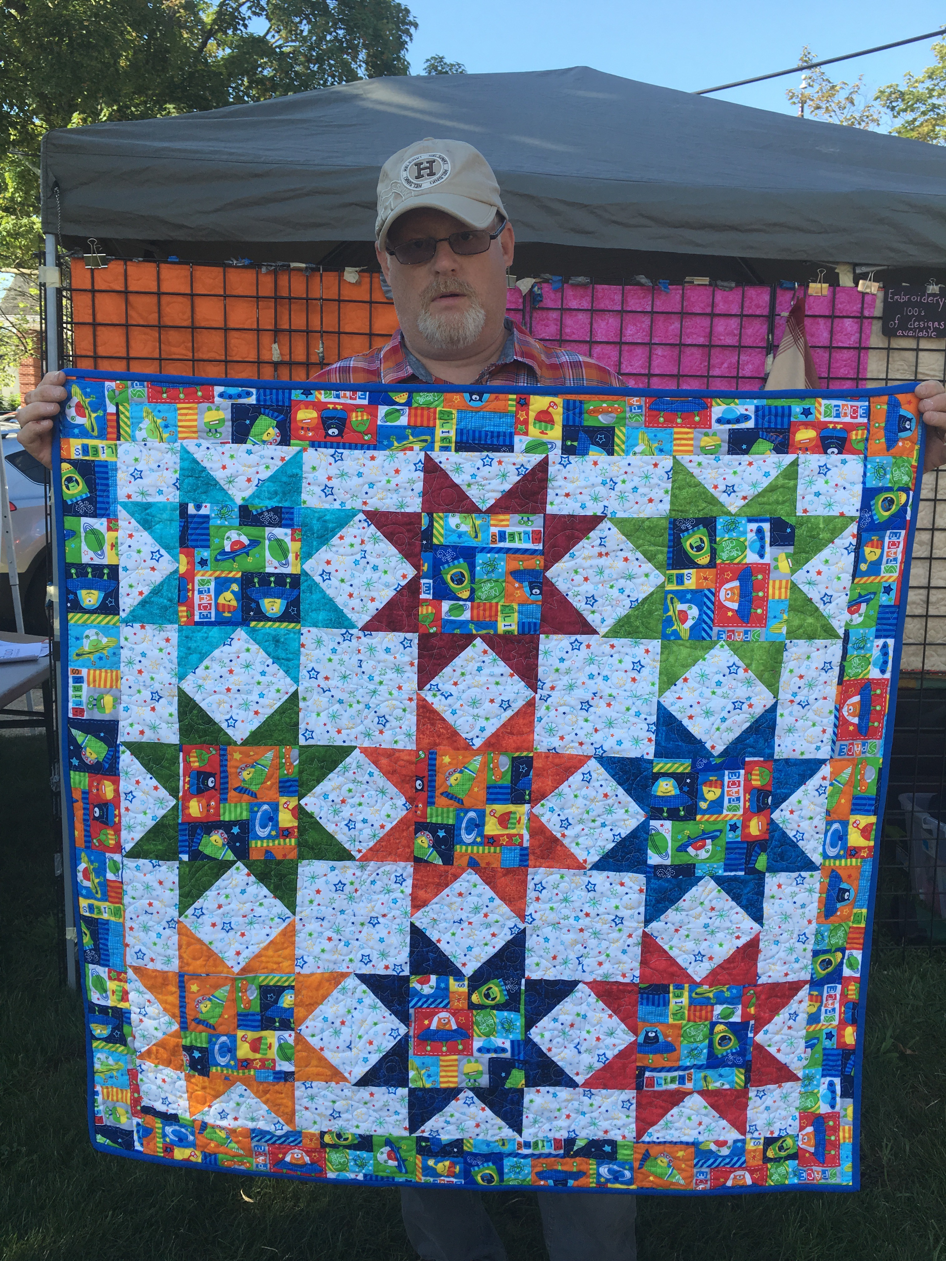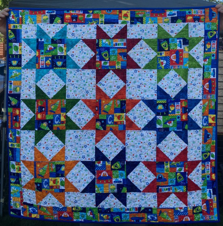 I have to admit it, I have a thing for space themed baby quilts. I don’t know if it is the unlimited potential that space represents or how bright and colorful they tend to be. But I like them.