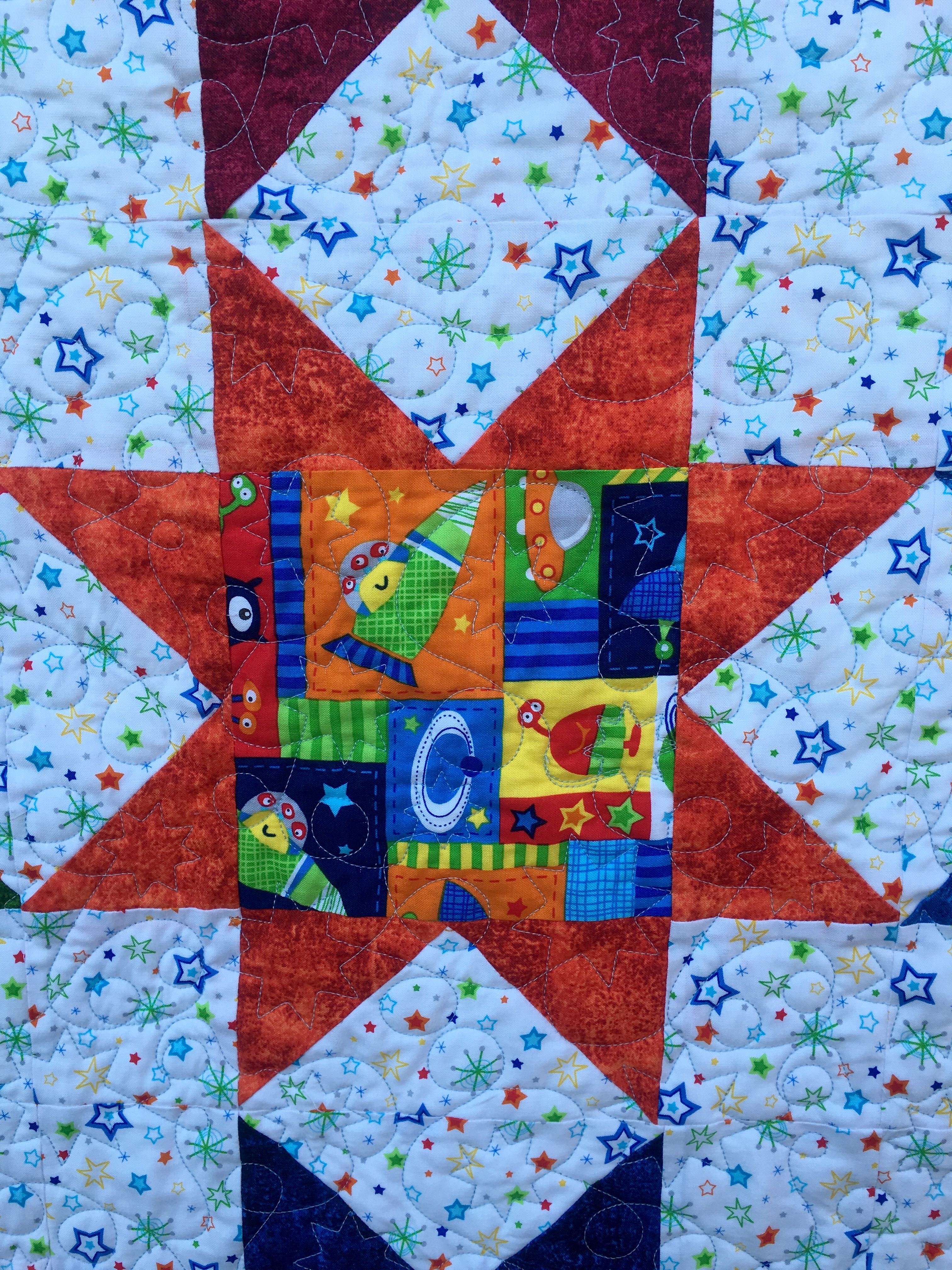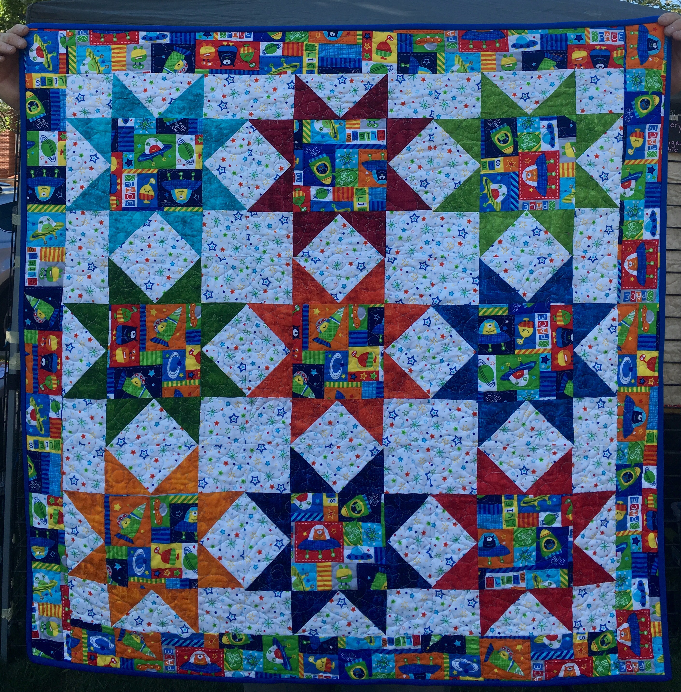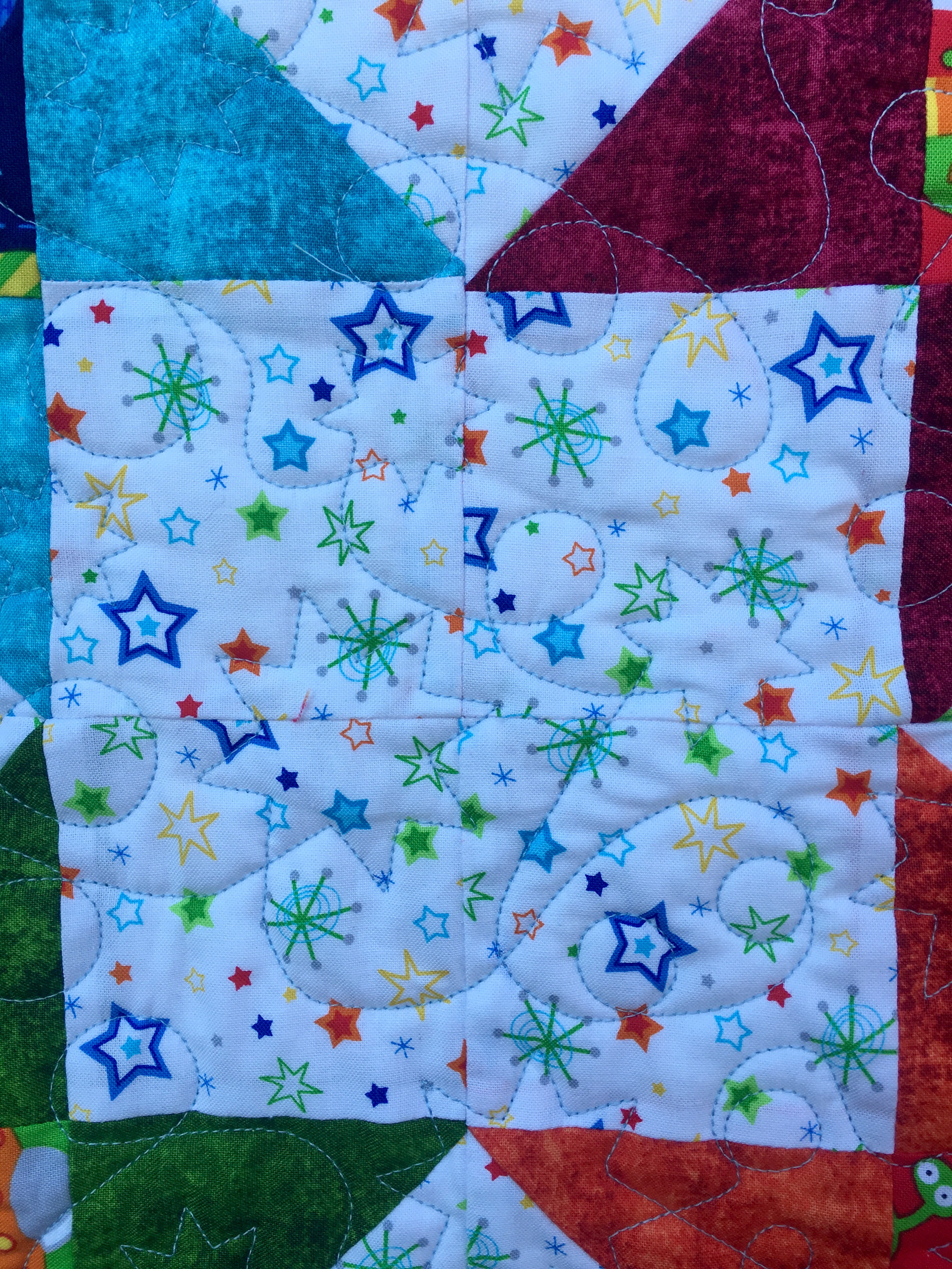 The quilting is an all over star and loop pattern that was pre-loaded on my Pro-Stitcher. It came out cute. For the second I am going to download something more space themes though.